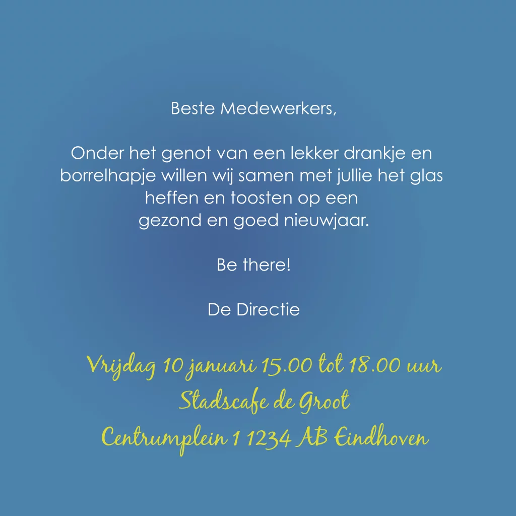 Uitnodiging voor een nieuwjaarsborrel met vuurpijlen en vuurwerk op een mooie blauwe achtergrond. Een spectaculaire uitnodiging voor het hele bedrijf! Hier gaan jullie wernemers / collega's heel blij van worden. Pas de tekst aan de binnenkant geheel naar wens aan.