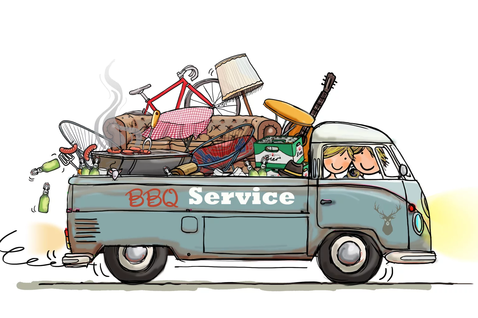 Grappige uitnodigingskaart voor een tuinfeest met een Volkswagen busje.