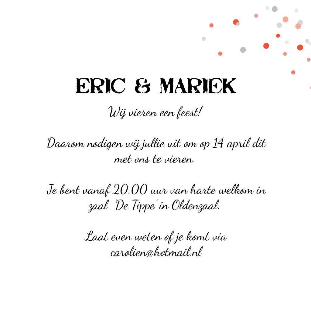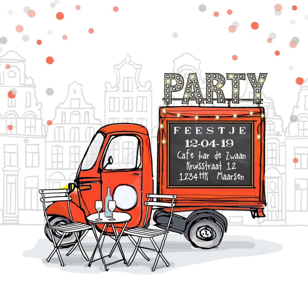 Bijzonder leuk getekende uitnodigingskaart van Vespa Ape met een achtergrond van huisjes en stippen.