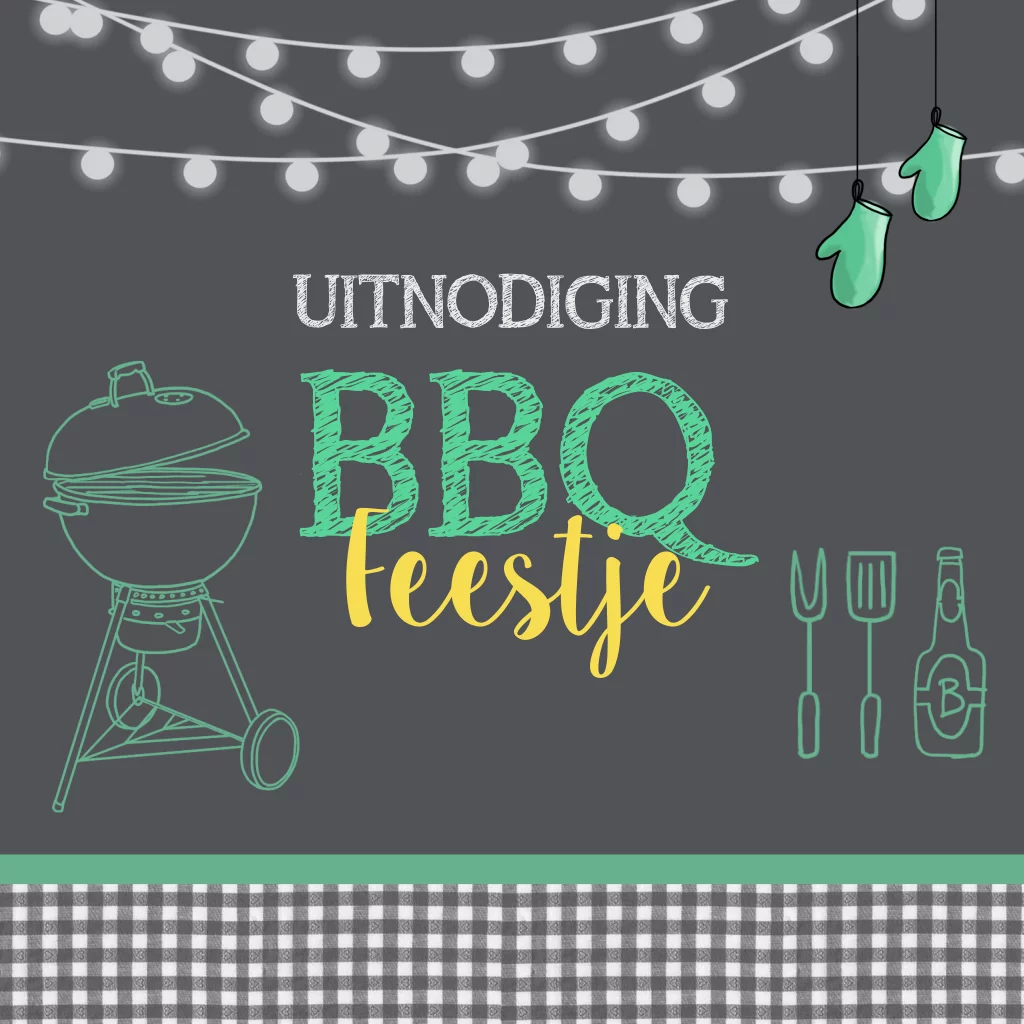 Uitnodiging voor een gezellig tuinfeest met lampjes, handschoenen en stoere bbq. De tekst kun je geheel zelf aanpassen. Mooi met een groene kleur envelop en een vrolijke sluitzegel erbij!