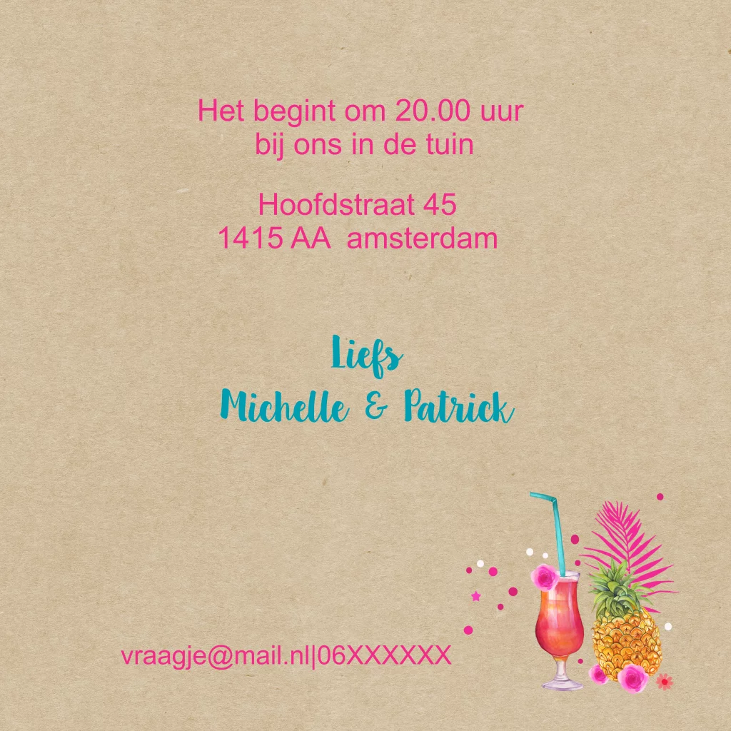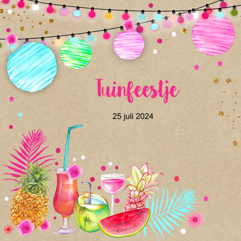 Uitnodiging voor een tropical party met kraftlook. Leuk om je verjaardag eens te vieren met een vrolijk thema. Ananas, meloen, lampionnen en cocktails!