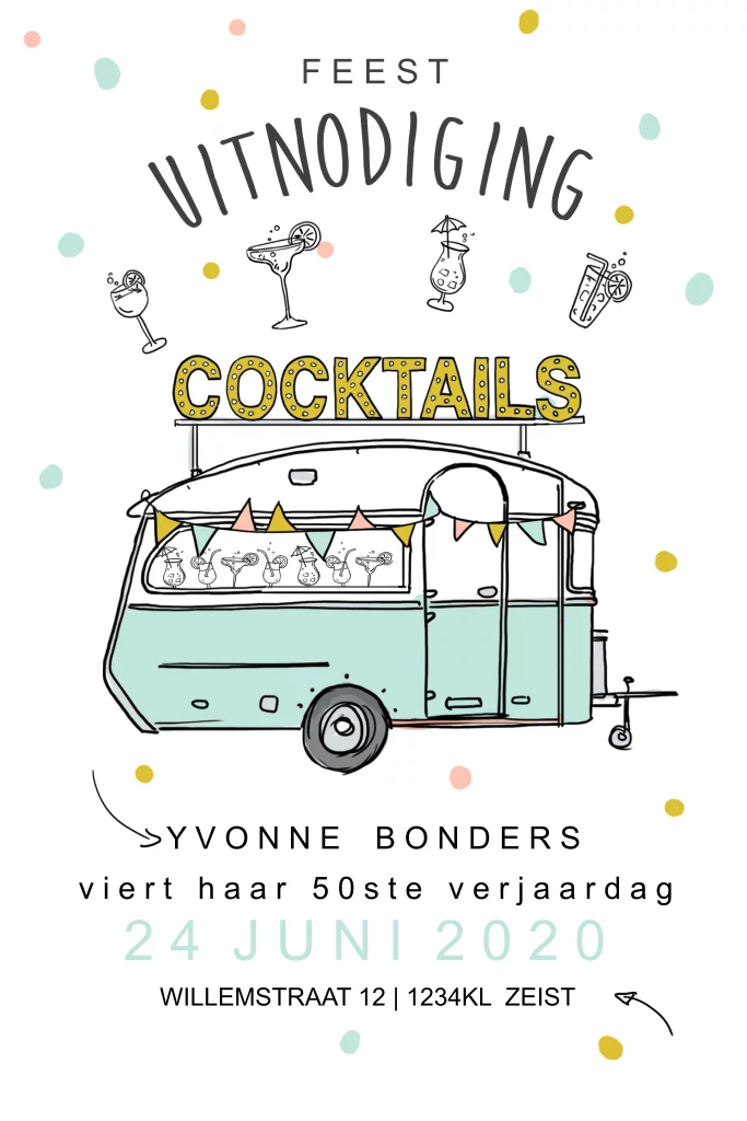 Leuke originele uitnodiging met cocktail caravan met priklampen, confetti en cocktails. De ideale uitnodiging voor een gezellig feestje in de tuin.