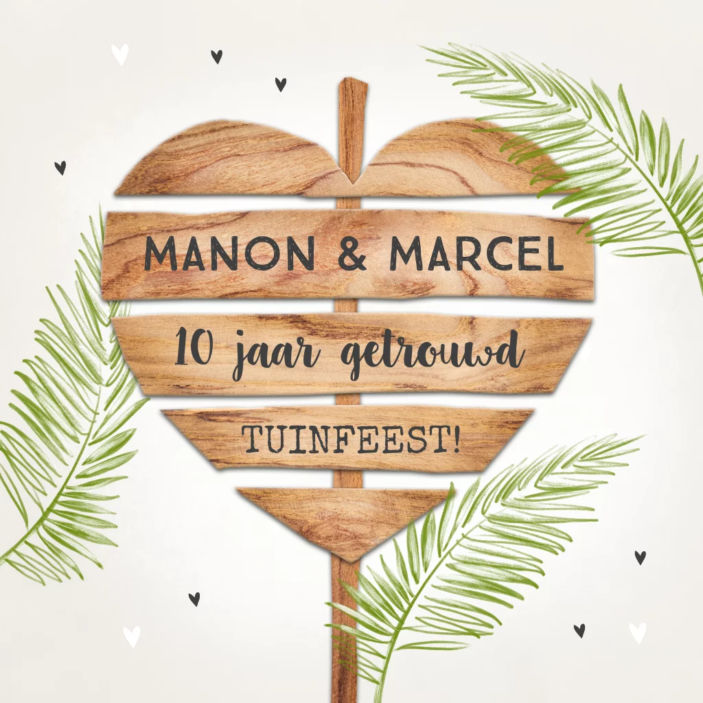 Wat een leuke uitnodiging voor jullie huwelijksjubileum. Leuk om dit te vieren met een tuinfeestje. Op de plankjes van de houten wegwijzer kun je een persoonlijke tekst kwijt. Leuk met botanische bladeren en hartjes. Kies voor een groene envelop!