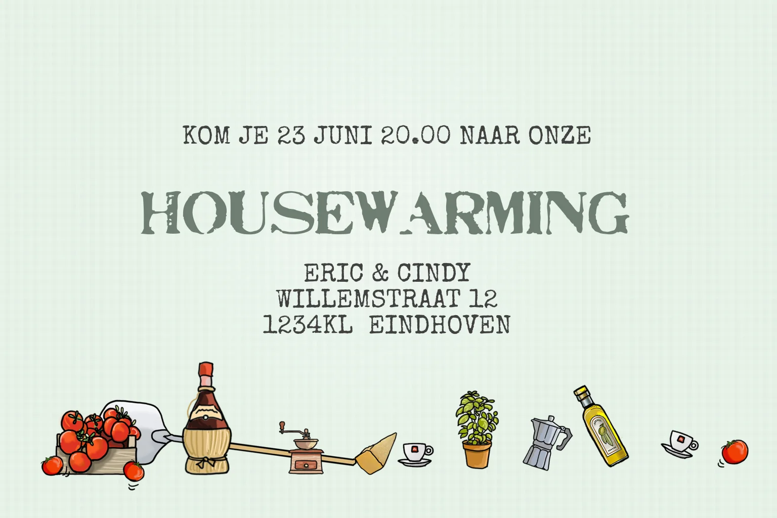 Vrolijke getekende rode Fiat 500 met leuke spullen op het dak. Tof om deze verhuiskaart te versturen naar vrienden en familie. Kies voor een bijpassende rode envelop.