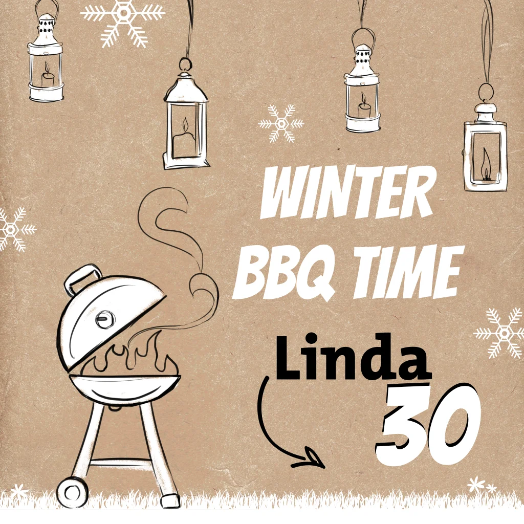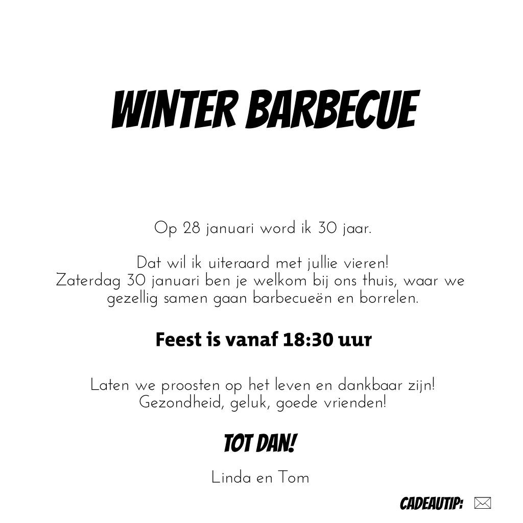 Een originele uitnodiging voor een winter BBQ. Mooie kraft achtergrond met sneeuwvlokjes en lampionnen. Gaaf met een parelmoeren envelop.