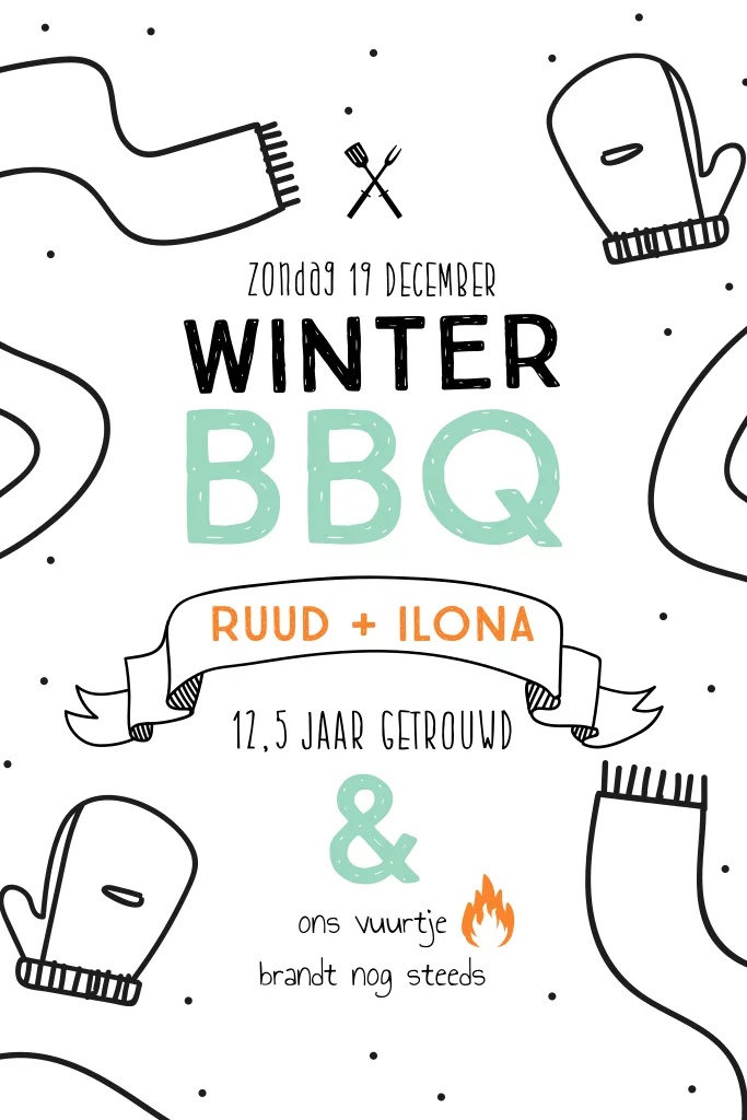 Een huwelijksjubileum deze winter? En je wilt nog een winters feestje vieren? Vier het dan met een gezellige winter barbecue. Daar past deze uitnodiging met wanten en sjaals perfect bij. Leuk met een mintgroene envelop erbij!