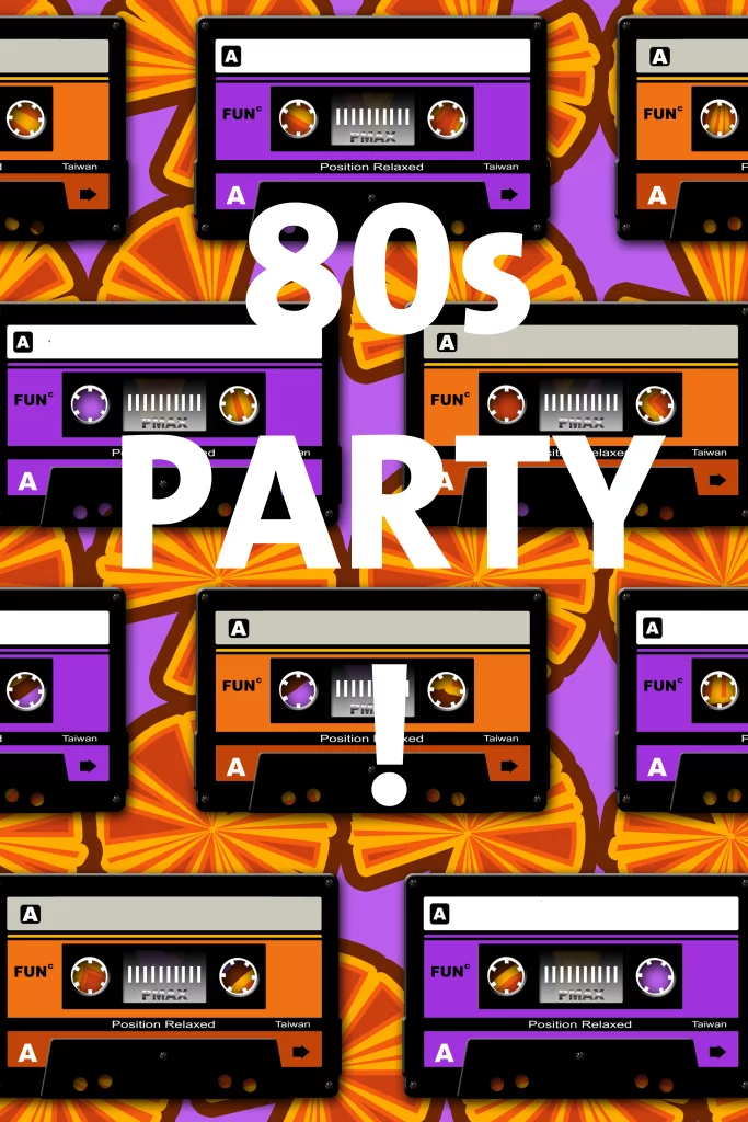Feestelijke kaart met cassettebandjes op een vrolijke retro achtergrond. Past perfect bij een back to the 80s party!