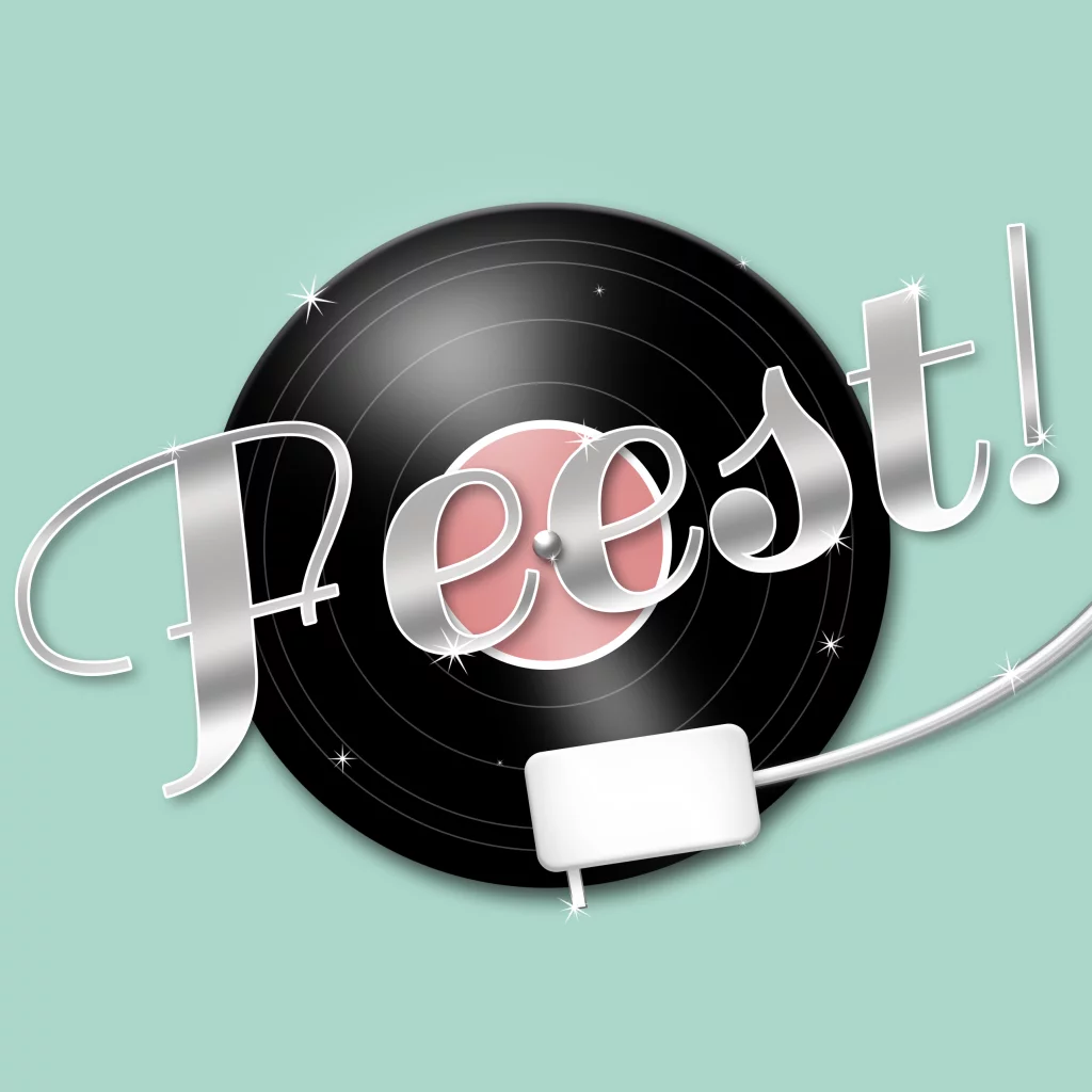 Leuke 80s party uitnodiging met een LP en het woord feest in grote zilverkleurige letters op een mint groene achtergrond. Nodig vrienden en familie uit met deze themafeest uitnodiging. De binnenkant is leuk versierd met muzieknoten. Leuk met een mintgroene envelop.