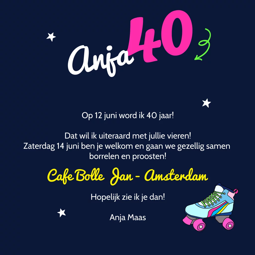 Vrolijke uitnodiging voor een Back to the 80s thema feest. Nodig al je vrienden en familie uit voor jouw 40e verjaardag. Dresscode is wel duidelijk met deze uitnodiging. Compleet met rolschaatsen, sterren en persoonlijke foto. Gaaf met een felle envelop erbij! Met zijn allen oude tijden herleven.