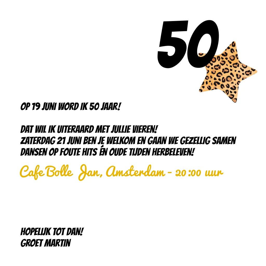 PARTY: Hoe fouter, hoe beter! Binnenkort 50 jaar en bent op zoek naar een gezellig thema voor je party? Kies voor het foute feestje! Nodig al je gasten uit met deze panterprint en gouden glitter kaart. Vergeet vooral de foute dresscode niet te vermelden.