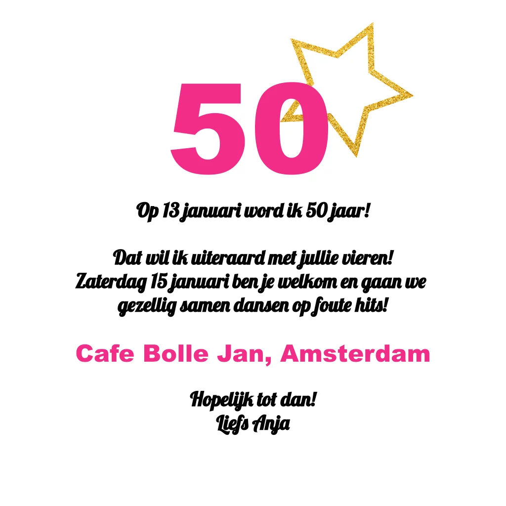 Proud to be fout! Binnenkort 50 jaar en bent op zoek naar een vrolijk thema voor je party? Kies voor het foute feestje! Nodig al je gasten uit met deze roze en gouden glitter kaart. Vergeet vooral de foute dresscode niet te vermelden.