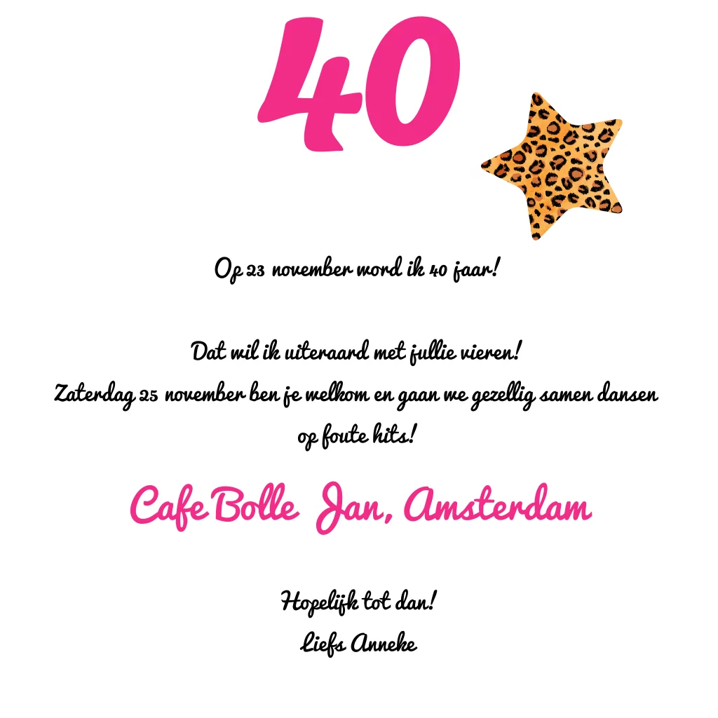 Proud to be fout! Binnenkort 40 jaar en bent op zoek naar een gezellig thema voor je party? Kies voor het foute feestje! Nodig al je gasten uit met deze panterprint en gouden glitter kaart. Vergeet vooral de foute dresscode niet te vermelden.