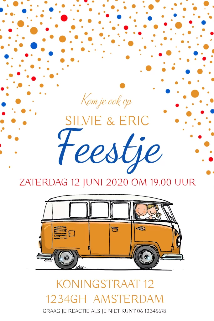Leuke hippe uitnodigingskaart voor een echt hollands feestje met rode, blauwe en oranje confetti, leuk volkswagen busje. Getekend door Anet Illustraties. Maak het af met een rode of oranje envelop!