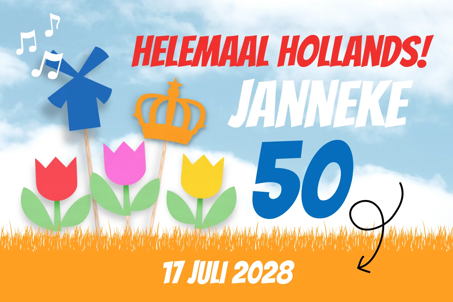 Ik hou van Holland! Vier je 50e verjaardag eens anders, geef een themafeestje! Biertjes, blokjes kaas, bitterballen en Hollandse hits. Vier het met een echte Hollandse Avond. Deze uitnodiging met molen, tulpen en kroontje maakt het thema helemaal af!