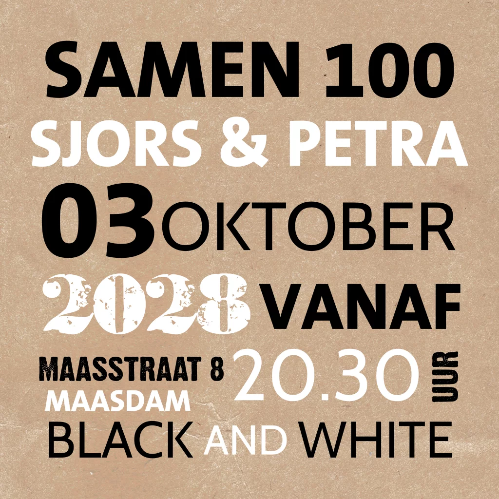 Vieren jullie binnenkort een samen 100 feestje? Nodig je gasten uit met deze leuke typografie uitnodigingskaart.