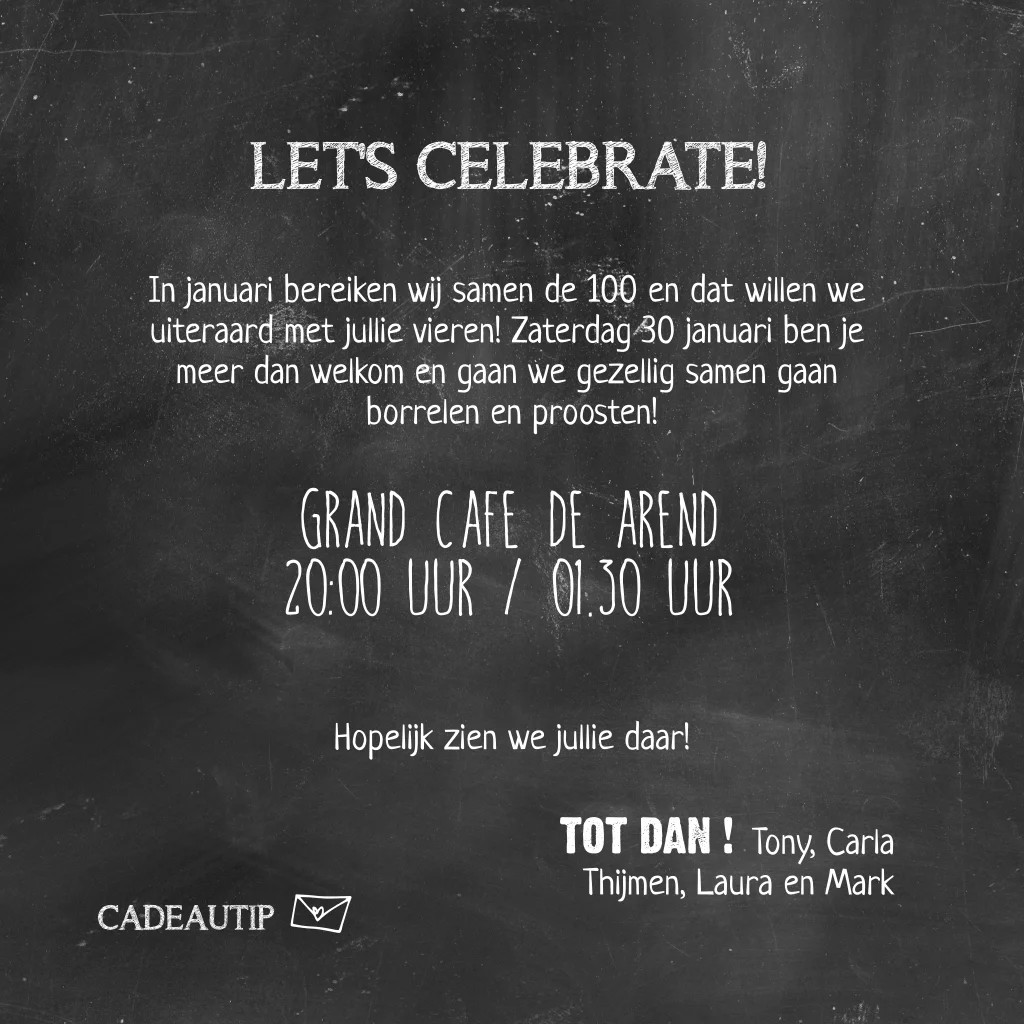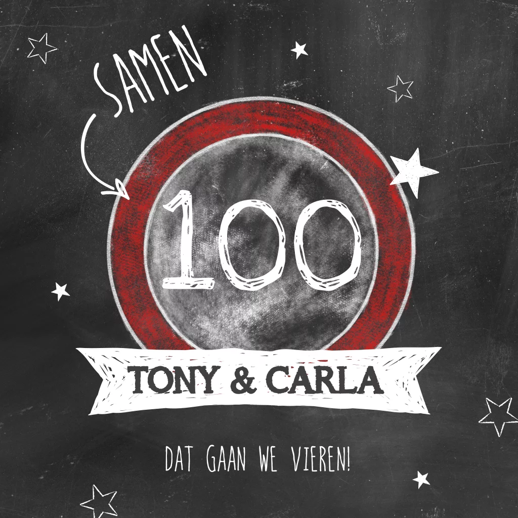 Een vrolijk geïllustreerde snelheidsbord op een krijtbord achtergrond met sterren. Hoe leuk is het om je samen 100 feest zo aan te kondigen. Proost op jullie mooie mijlpaal. Gaaf met een rode envelop, lekker opvallend op de deurmat!