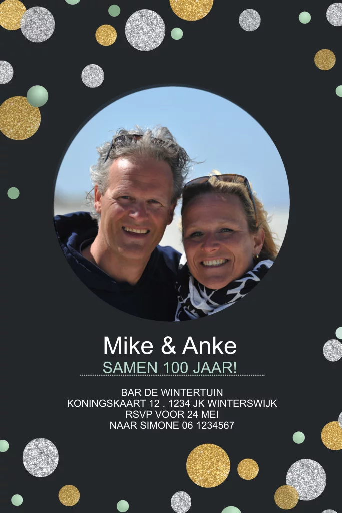 Feestelijke uitnodiging voor een samen 100 verjaardag. Door de zwarte achtergrond springen de goud en zilverkleurige glitter bollen echt uit de kaart. Achter de ronde fotokader kun je een persoonlijke foto van de twee jarigen plaatsen. Leuk met een bijpassende envelop en sluitstickers.