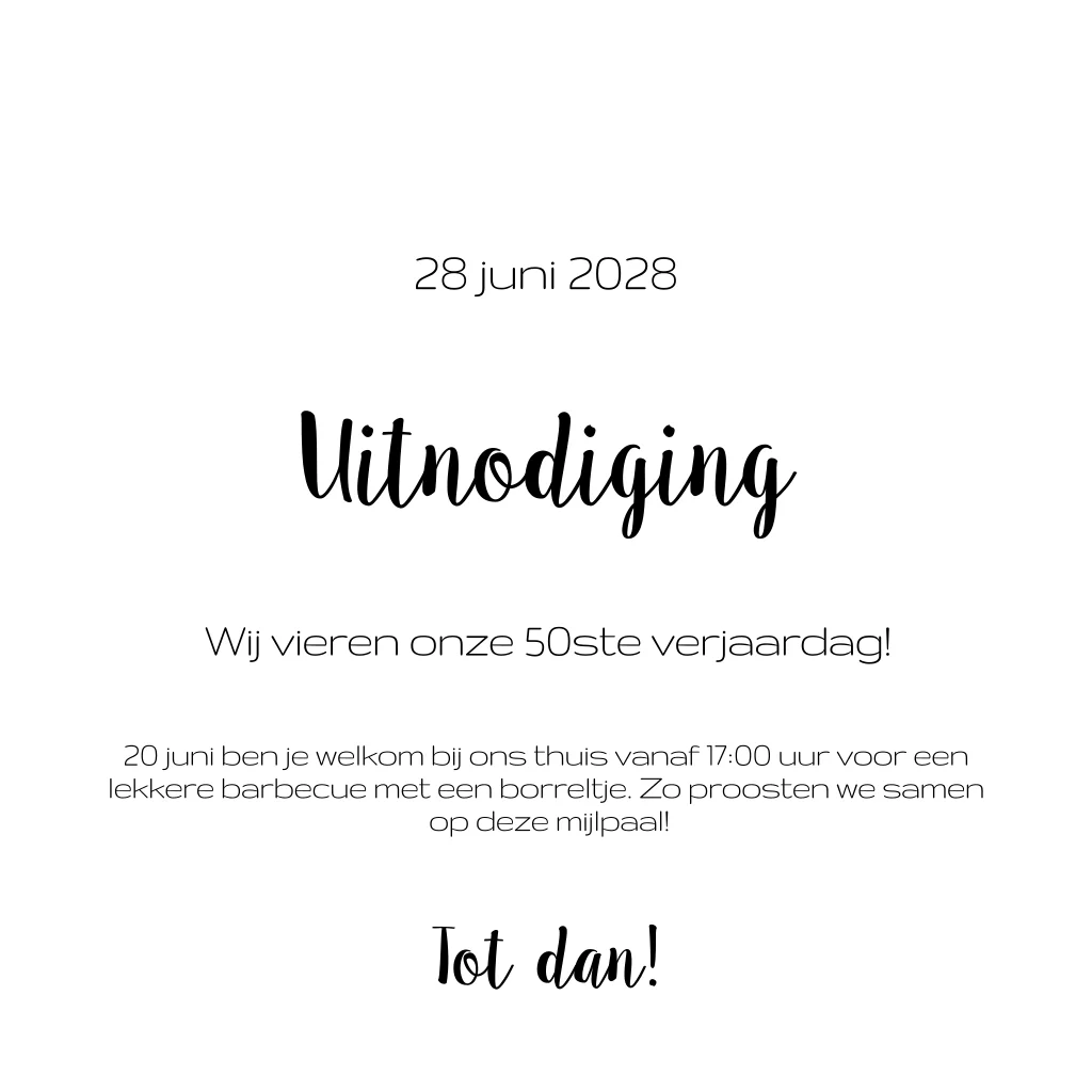 Hele feestelijke uitnodiging met gekleurde glitter stippen. Hoe leuk is het om een 50e verjaardag samen te vieren? Leuk is ook de ruimte voor een foto van jullie samen! Maak het af met een felle kleur envelop en bijpassende sluitzegel!