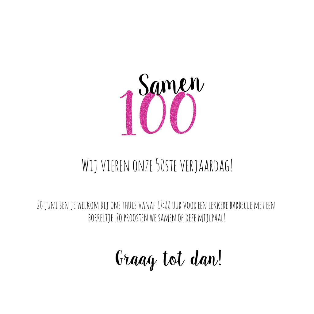 Vrolijke uitnodiging met feestelijke glitter slingers. Hoe leuk is het om je 50e verjaardag met je beste vriendin te vieren? Op de samen 100 uitnodiging kan ook nog een foto van jullie samen. Maak het af met een felle kleur envelop en bijpassende sluitzegel!