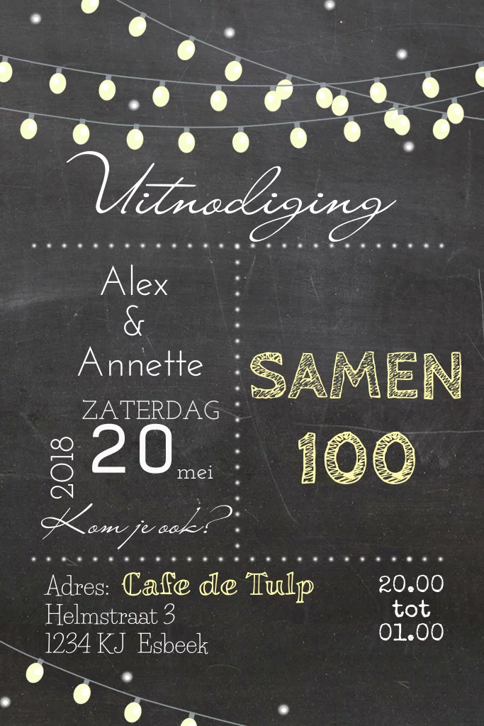 Uitnodigingskaart samen 100 in krijtbord met lichtjes