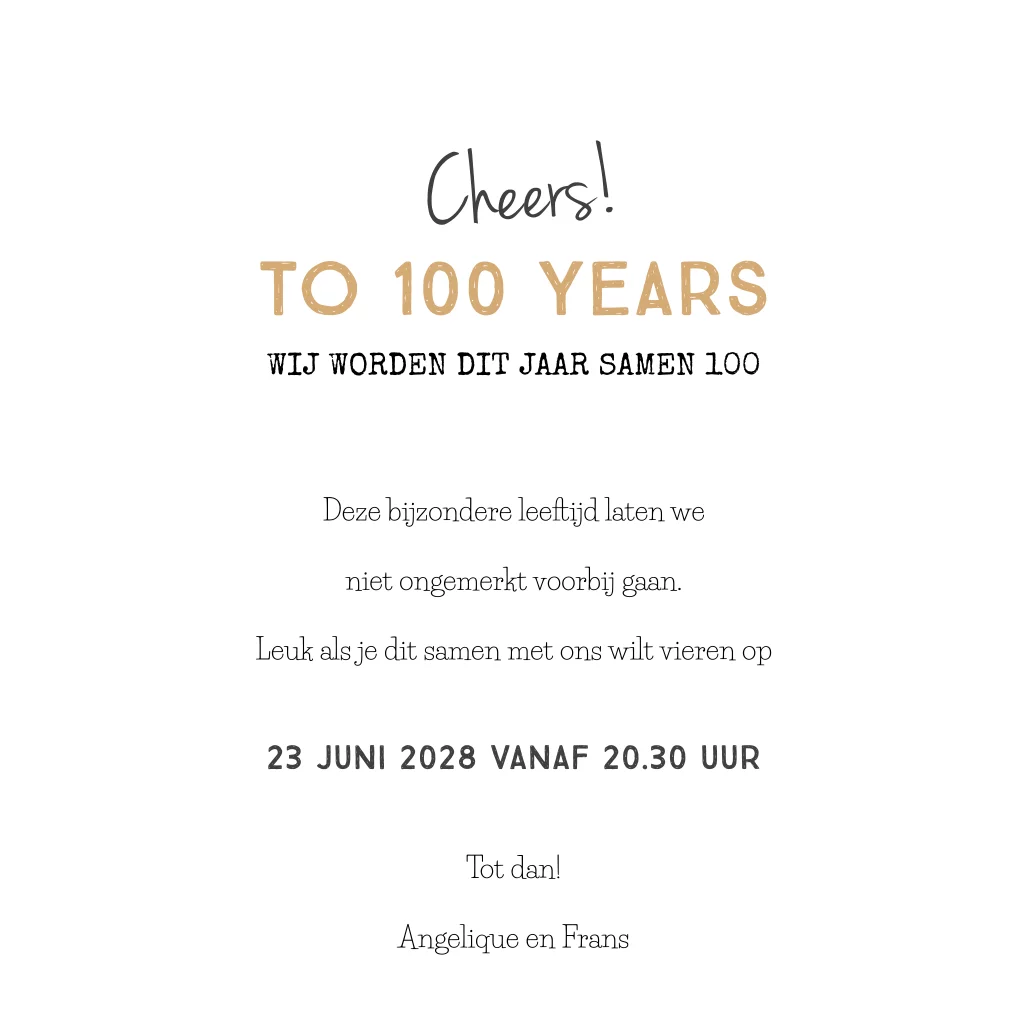 Wat een vrolijke uitnodiging! Leuk om te versturen wanneer jullie als Abraham en Sarah samen je 50e willen vieren. Deze uitnodiging voor een samen 100 feestje heeft vrolijke confetti en een wegwijzer. Op elk bordje kun je een persoonlijke tekst plaatsen. Leuk ook om een foto van jullie samen toe te voegen.