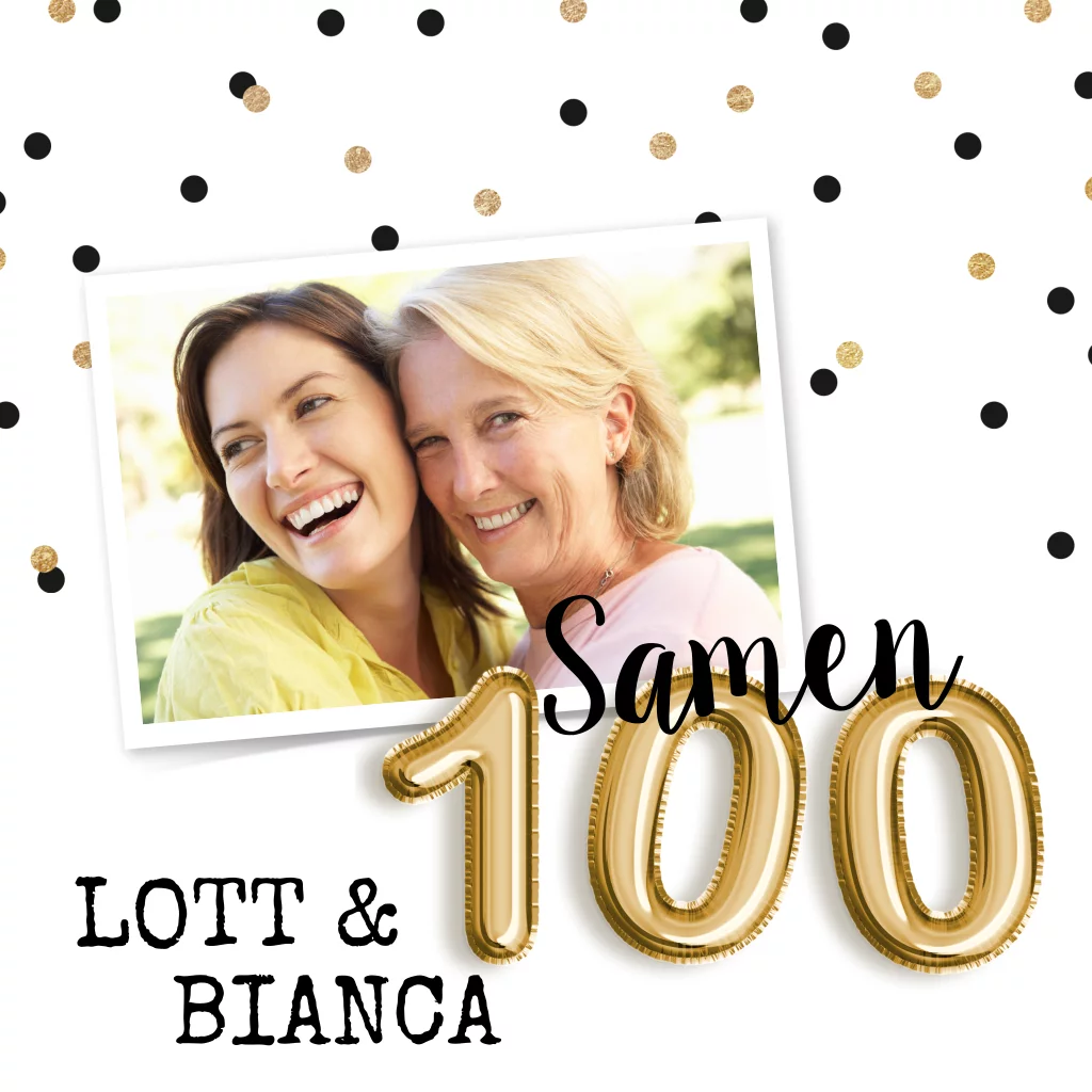 Samen 100! Vier jullie 50e verjaardag gezellig samen. Vrolijke kaart met een confetti achtergrond en gouden cijfer ballonnen. Persoonlijk door de foto van jullie samen. Maak het af met een gouden kleur envelop en bijpassende sluitzegel!