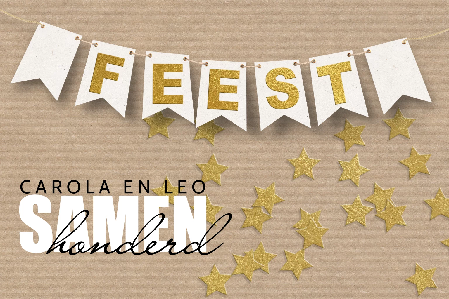 Deze feestelijke uitnodiging is perfect voor een samen 100 party. Extra feestelijk door de slinger en gouden sterren. Waarom niet het feestje vieren in de tuin met BBQ?!