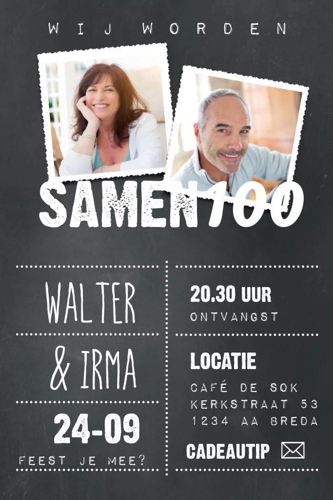 Uitnodiging samen 100 verjaardag met foto en krijtbord