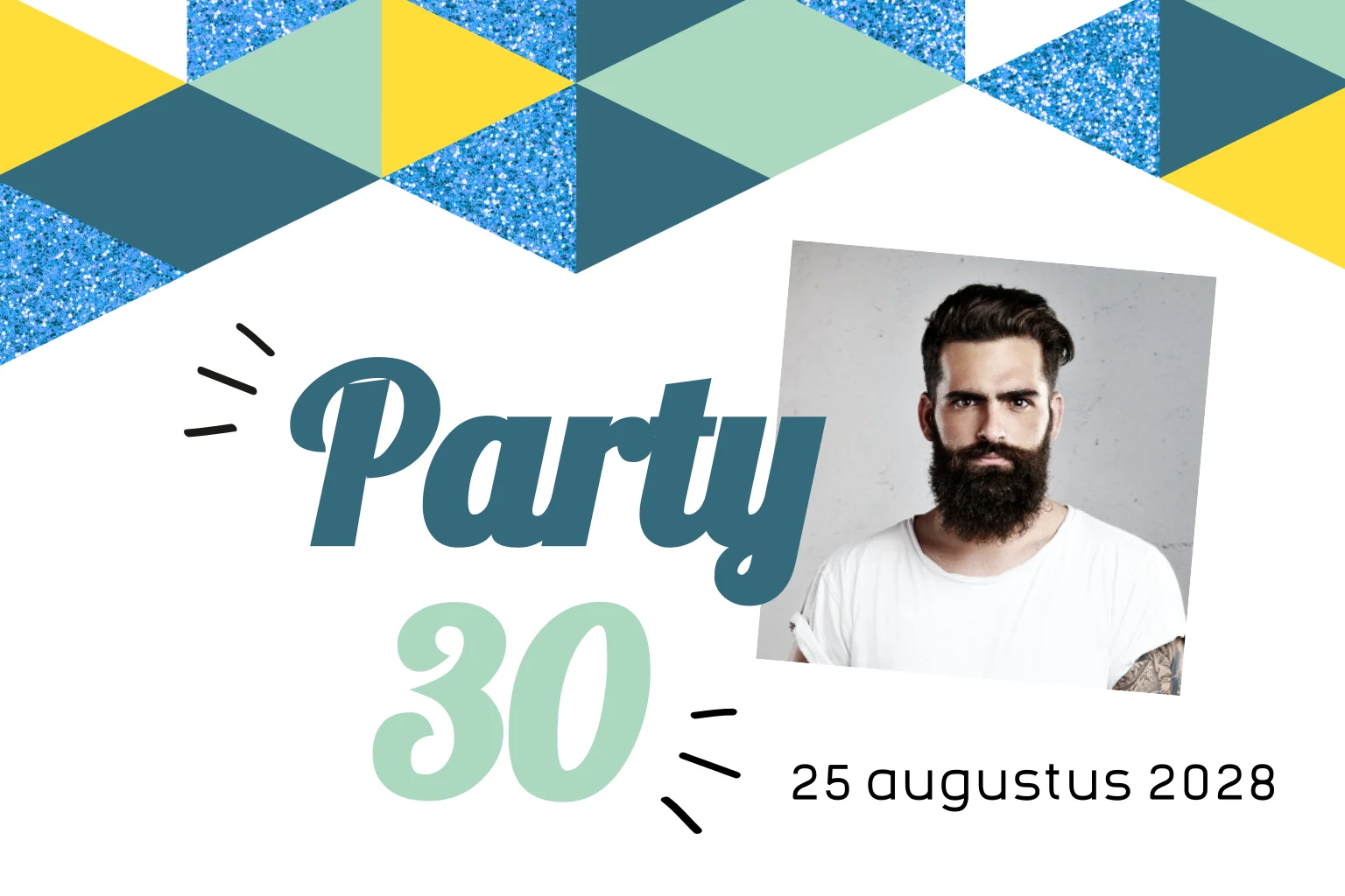Party! Kies voor deze ontzettend feestelijke uitnodiging met blauwe glitter! Gaaf die geometrische driehoekjes en persoonlijke foto op de voorkant. Maak het af met een bijpassende blauwe of mintgroene envelop.