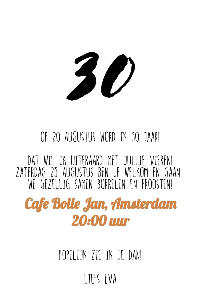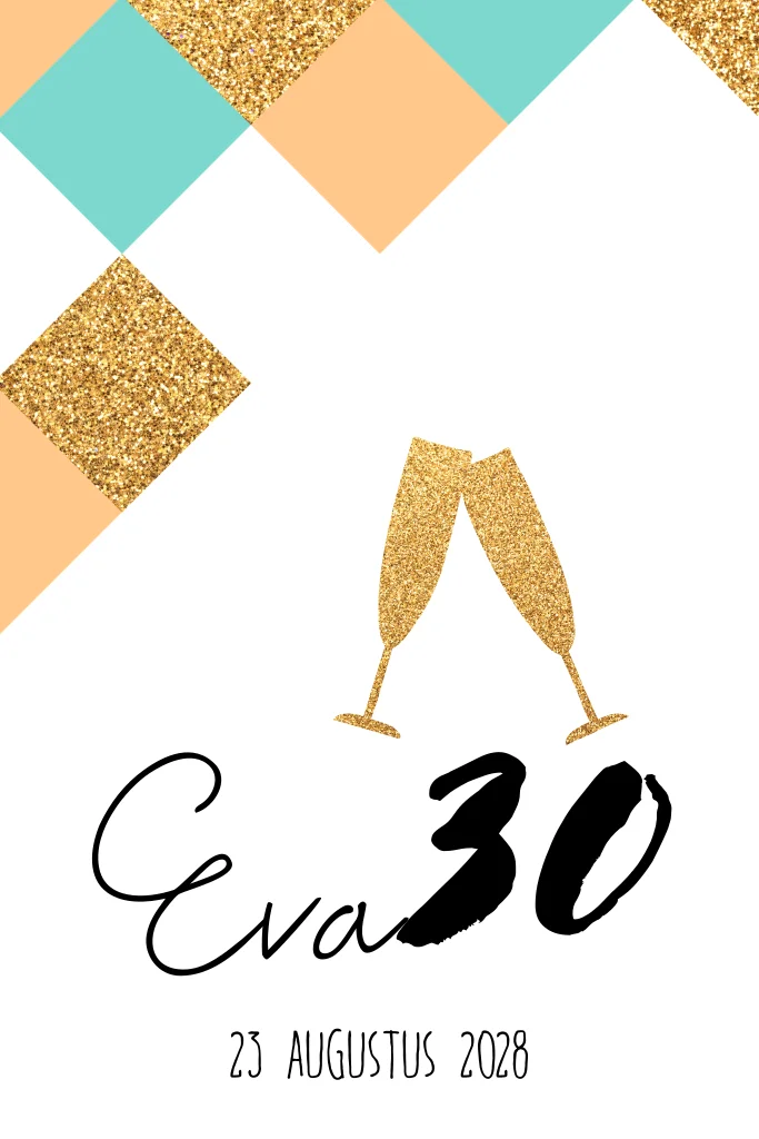 Dertig jaar, proost! Kies voor deze ontzettend feestelijke uitnodiging met gouden glitter!Gaaf die geometrische vierkantjes en champagneglazen. Aan de binnenkant ruimte voor een persoonlijke foto. Maak het af met een bijpassende envelop, bijvoorbeeld onze mintgroene of peach kleur.