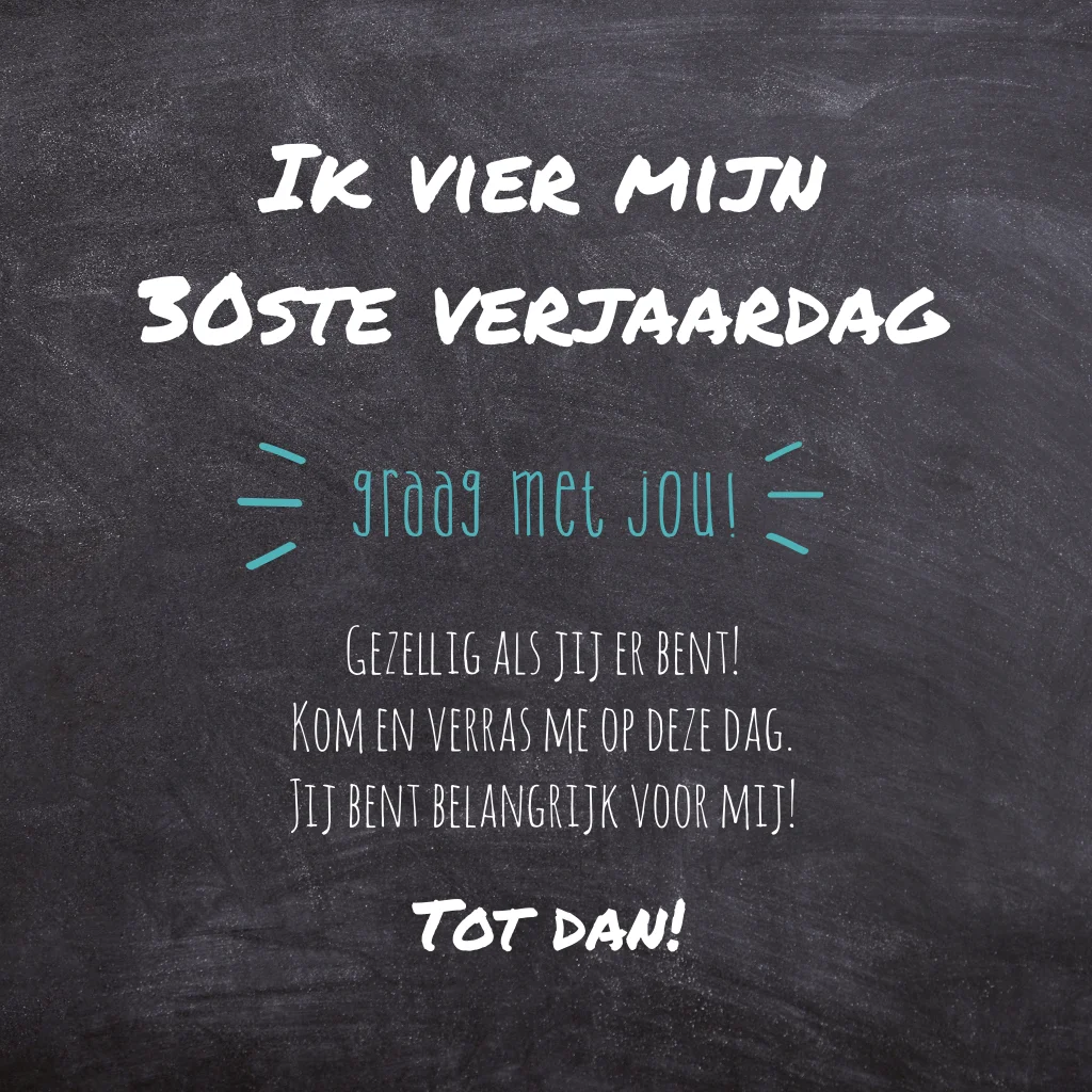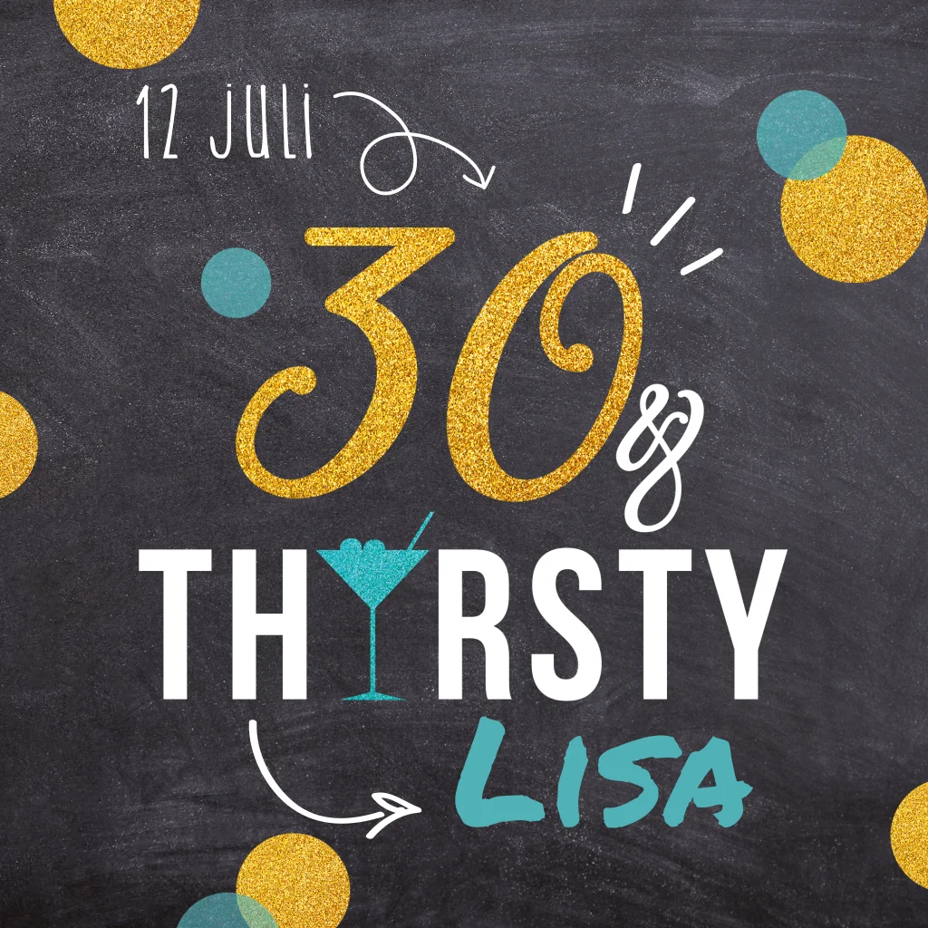 30 and thirsty! Feestelijke uitnodiging voor je dertigste verjaardag. Door het schoolbord achtergrondje springen de gouden glitter elementjes er echt uit. Leuk versiert met cocktails en muzieknoten.