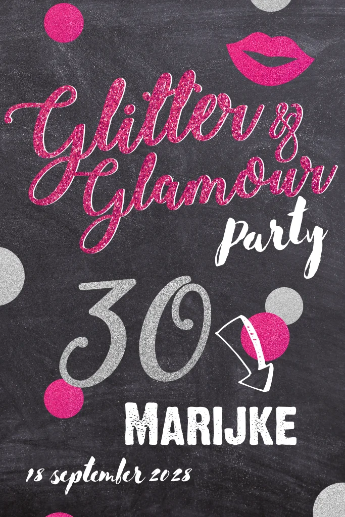Glitter and Glamour party! Feestelijke uitnodiging voor je dertigste verjaardag. Door het schoolbord achtergrondje springen de roze glitter elementjes er echt uit. Leuk versiert met stippen en roze mondje.