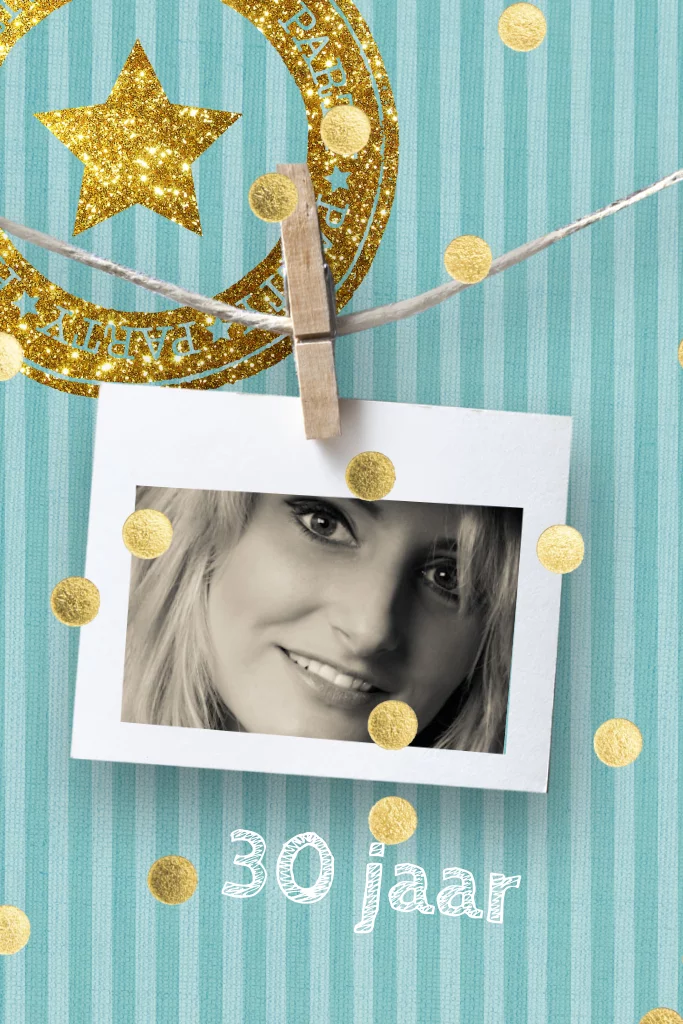 Hippe uitnodiging voor je 30e verjaardag met stempel, confetti en leuke strepen! Nodig al je vrienden uit op deze feestelijke manier!
