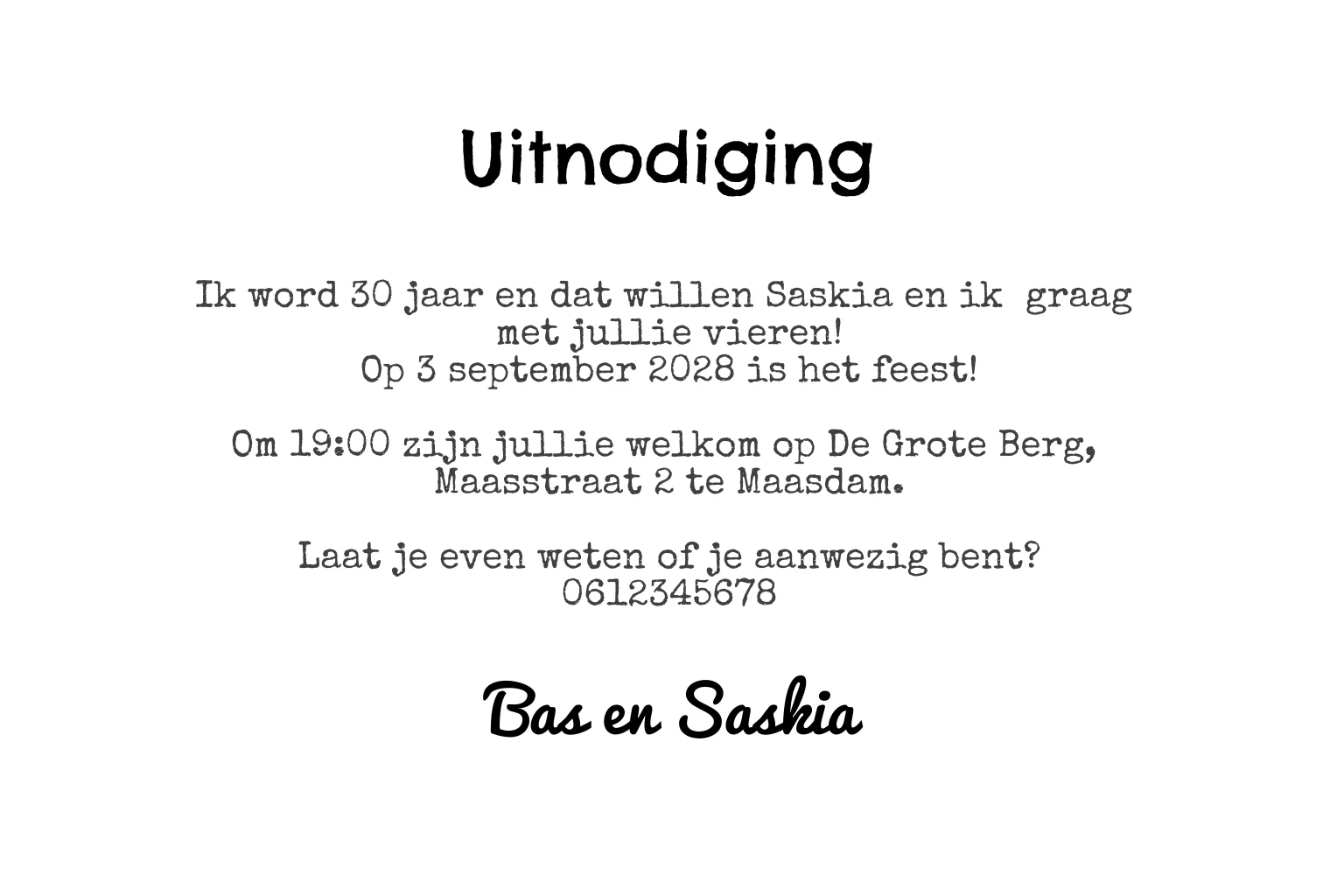 Deze feestelijke uitnodiging voor je 30e verjaardag is perfect om te versturen naar vrienden en familie. Lekker vrolijk door de gekleurde wegwijzer en leuke teksten.