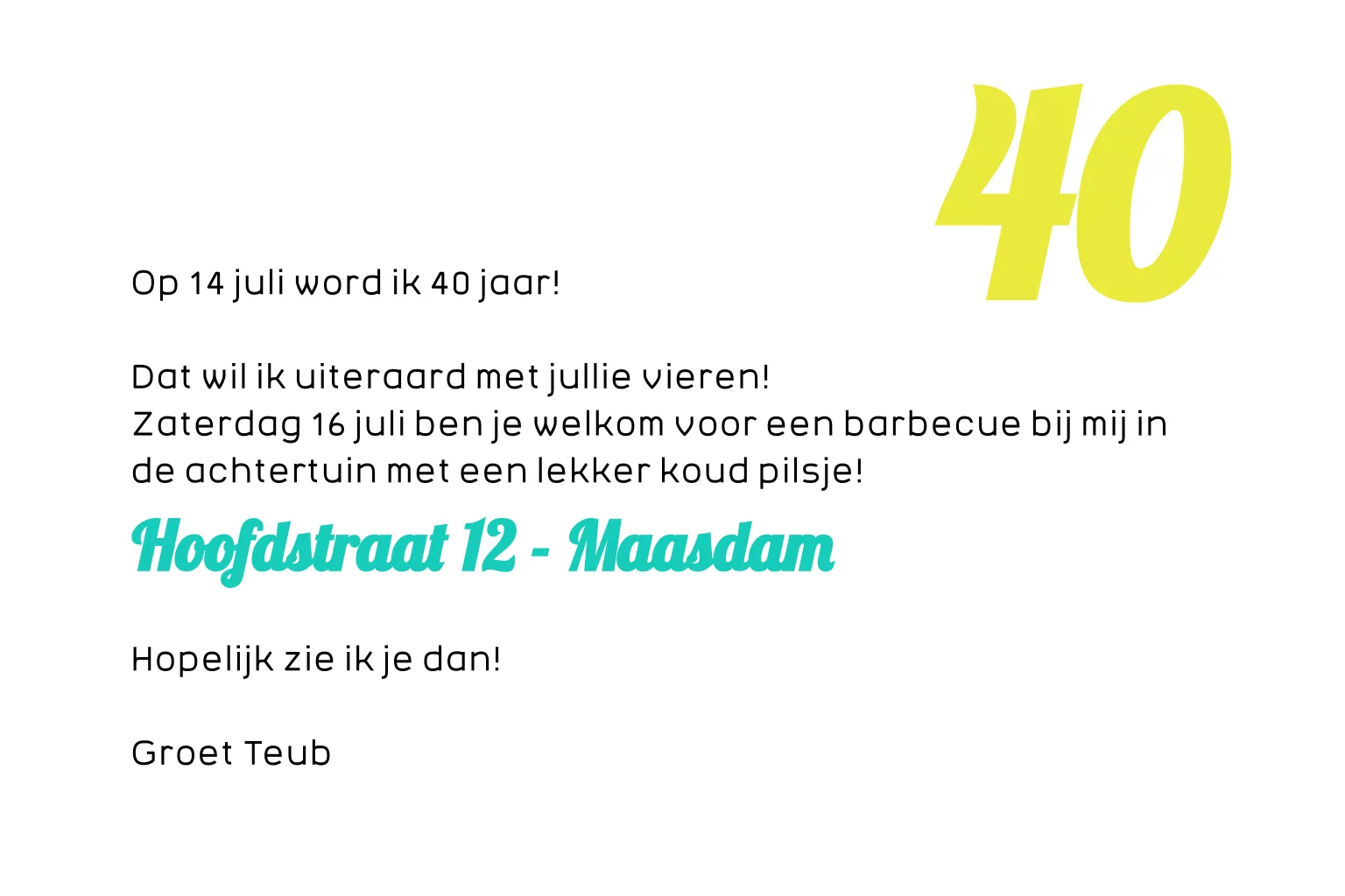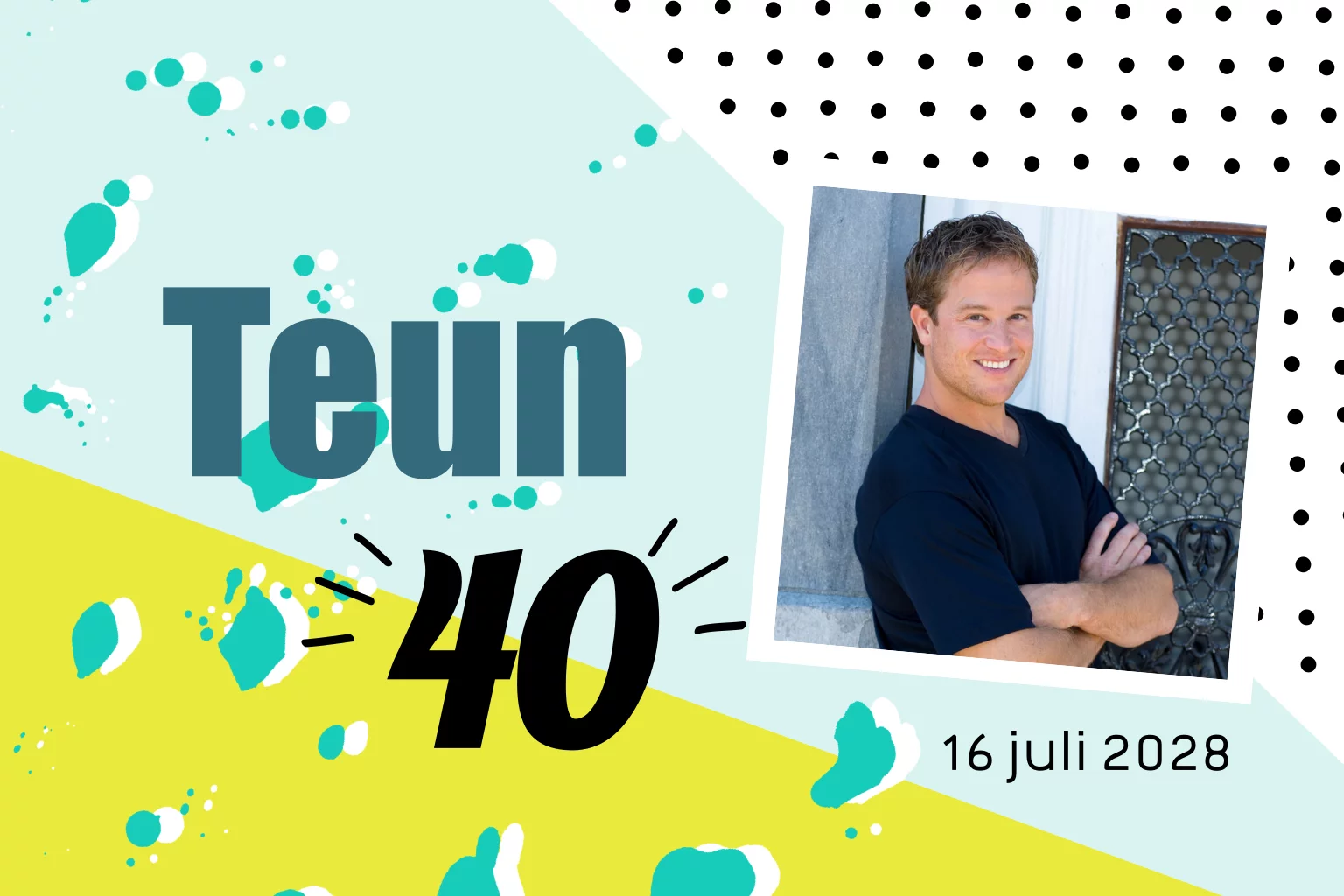 FEEST! Kies voor deze ontzettend feestelijke uitnodiging met vrolijke printjes! Gaaf die verfspetters en persoonlijke foto op de voorkant. Maak het af met een bijpassende gele of mintgroene envelop.