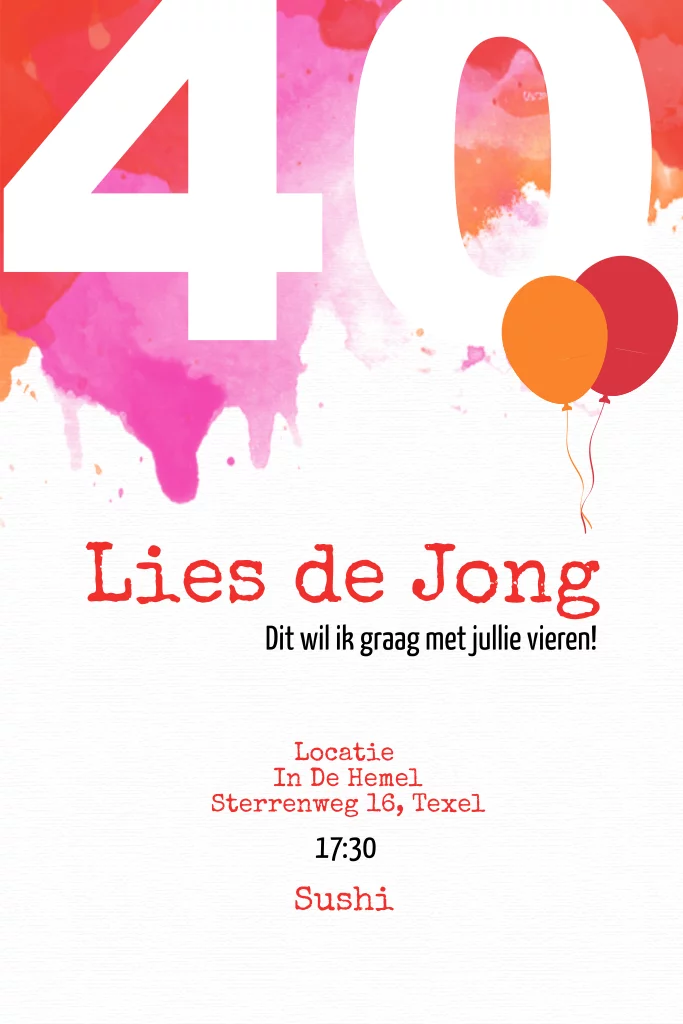 Mooie hippe uitnodigingskaart voor feestje 40 jaar in rood, roze, oranje watercolor design.
