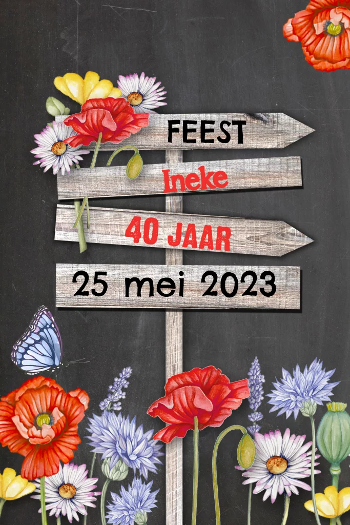 Mooie uitnodigingskaart met wegwijzer en veldbloemen