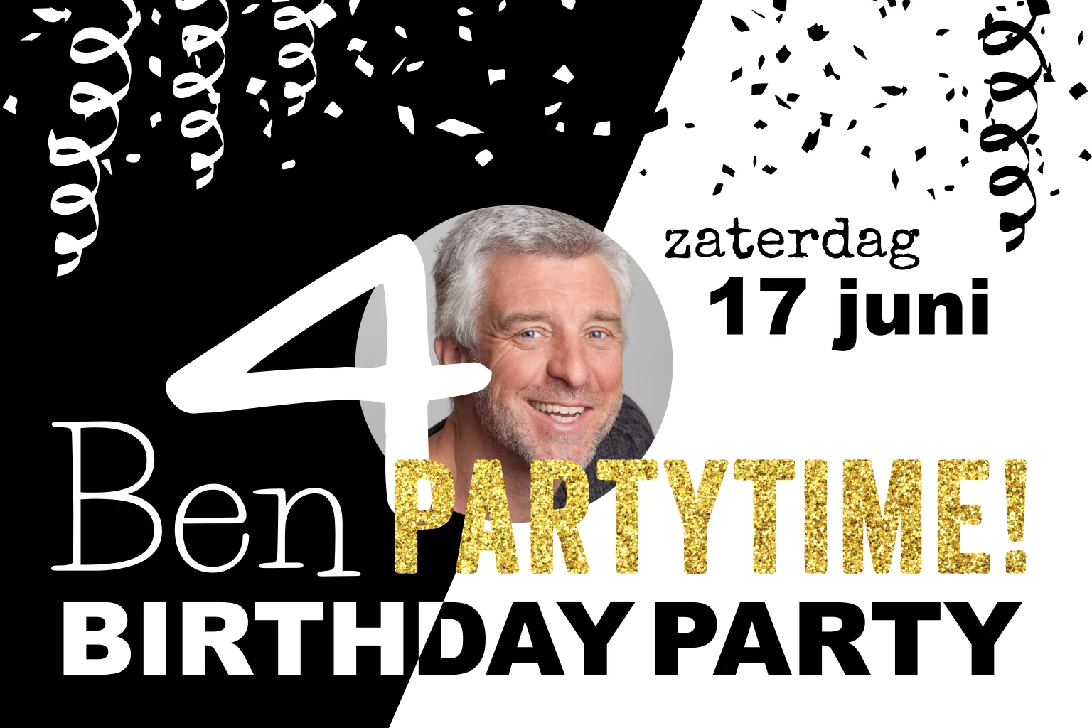 Super feestelijke uitnodiging door de toevoeging van gouden glitter op een zwart wit achtergrond. Gaaf ook met de persoonlijke foto op de kaart. Nu alleen nog kiezen voor een gouden envelop om het af te maken.