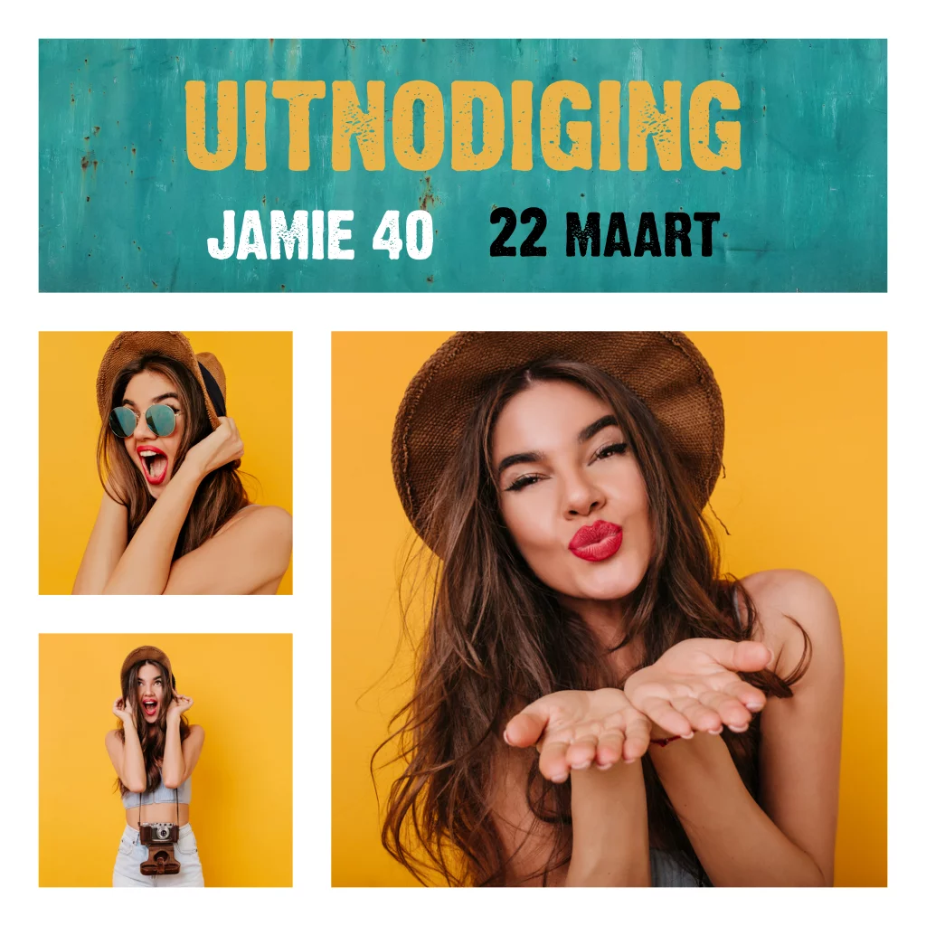 Leuke uitnodiging met je eigen fotocollage. Je kunt de foto's in alle vakjes vervangen en maakt zo een superleuke kaart met je eigen selfies.