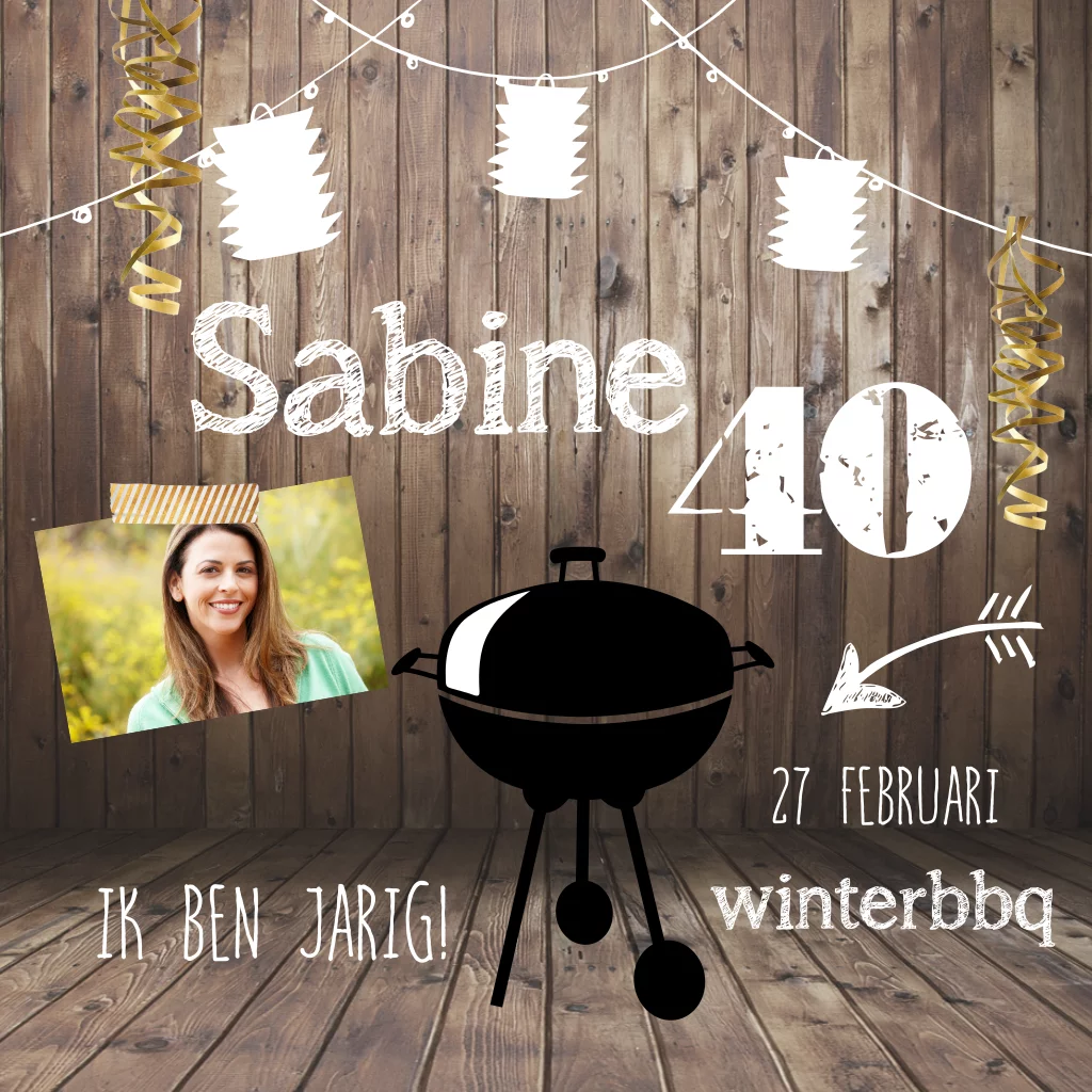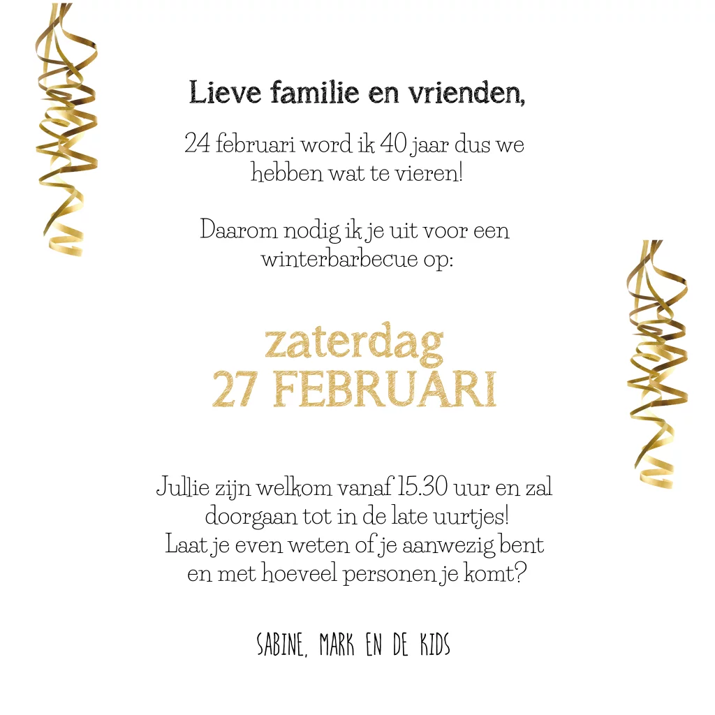 Vrolijke uitnodiging voor een winter barbecue rondom je 40e verjaardag. Nodig al je vrienden en familie uit voor een lekkere barbecue. De kaart is leuk geïllustreerd met lampionnen, foto en gouden serpentines.