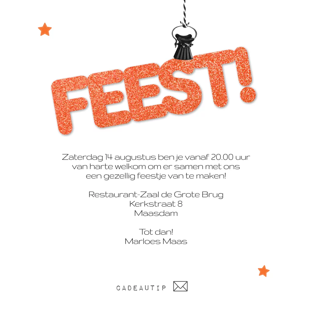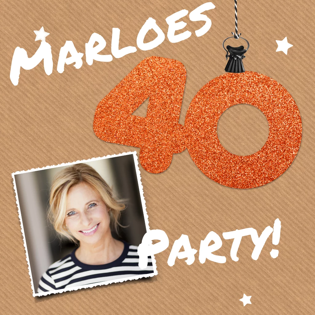Feestelijke uitnodiging verjaardag met grote oranje glitter 40! Deze springt helemaal uit de kraft kaart. Combineer de kaart met een oranje envelop en het is al een klein feestje wanneer deze op de deurmat van de genodigde valt!