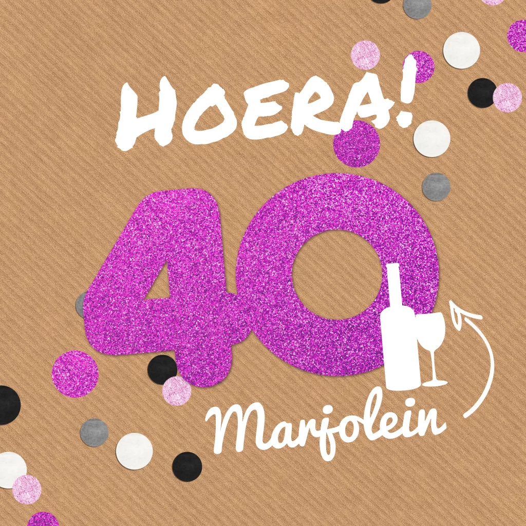 Feestelijke uitnodiging verjaardag met grote paarse glitter 40 en wijntje! Deze springt helemaal uit de kraft kaart. Combineer de kaart met een paarse envelop en het is al een klein feestje wanneer deze op de deurmat van de genodigde valt!