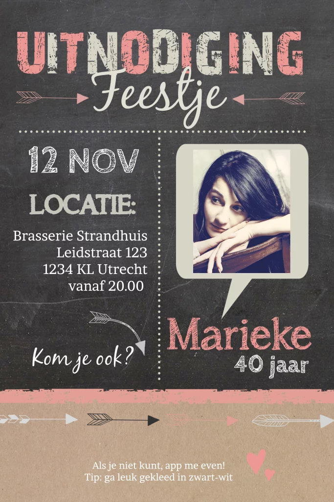 Stoere uitnodigingskaart met eigen foto en verschillende lettertypes.
