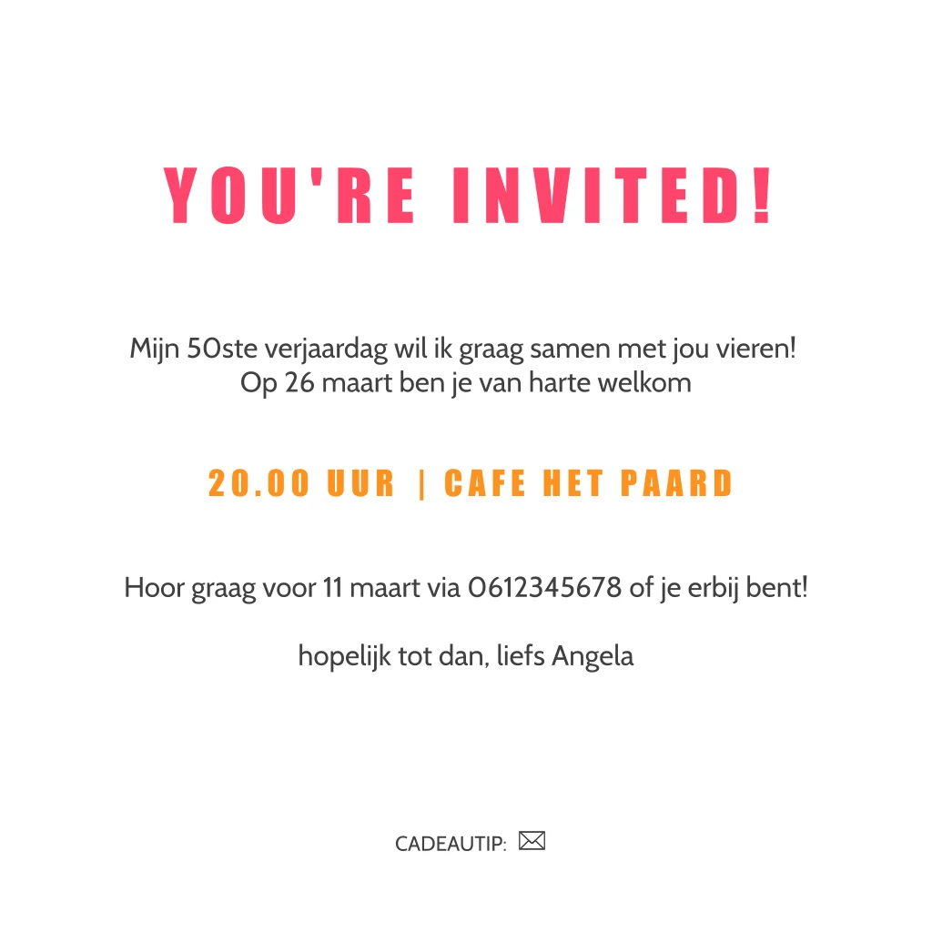 Kleurrijke en feestelijke uitnodiging voor een 50e verjaardag. Sarah zien mag groots gevierd worden. De 50 springt echt uit de kaart door de oranje kleur en de roze bollen achtergrond. Gaaf met bijpassende fel roze envelop.