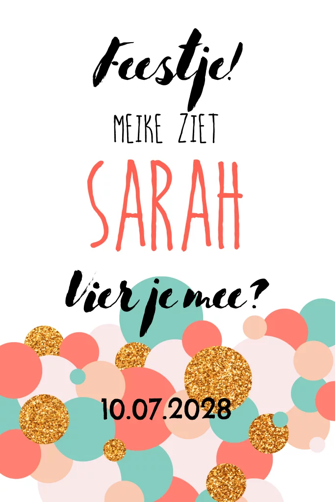 Sarah zien, dat is een feestje waard! Deze uitnodiging is zo ontzettend vrolijk door de kleurrijke peach en glitter confetti, dit is toch een feestje om te versturen? Maak het af door te kiezen voor een bijpassende peach kleur envelop.