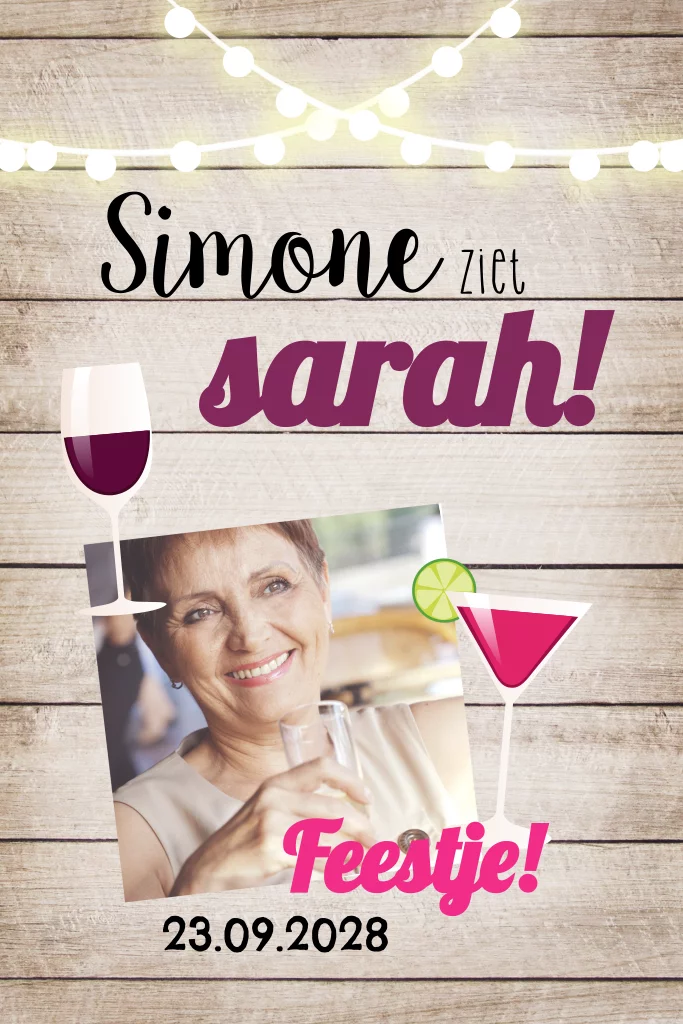 Sarah zien! Proost op jouw 50e verjaardag. Nodig vrienden en familie uit met deze leuke uitnodiging. Mooie houten achtergrond en geïllustreerd met een gezellig wijntje, lichtjes slinger en cocktail