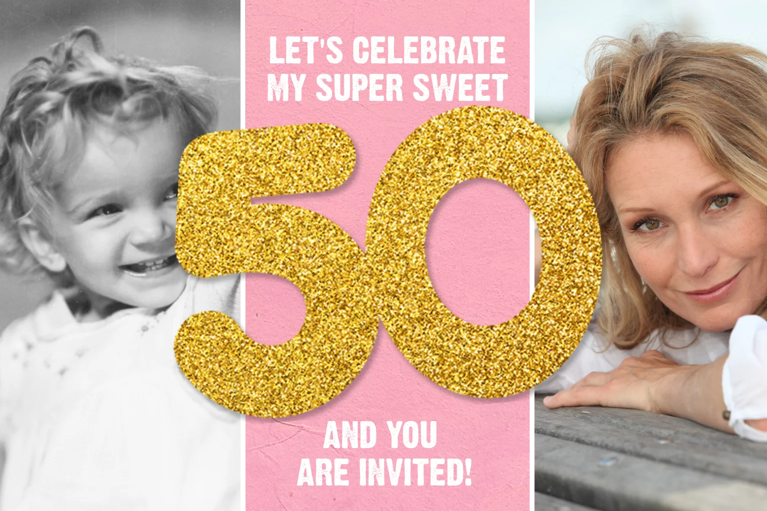 Vrolijke uitnodiging voor een 50e sarah verjaardag met een grote 50 opgemaakt met gouden glitters. Aan de voorkantkant is er ruimte voor foto's van de jarige, eentje van vroeger en eentje van nu. Gaaf met een gouden envelop.
