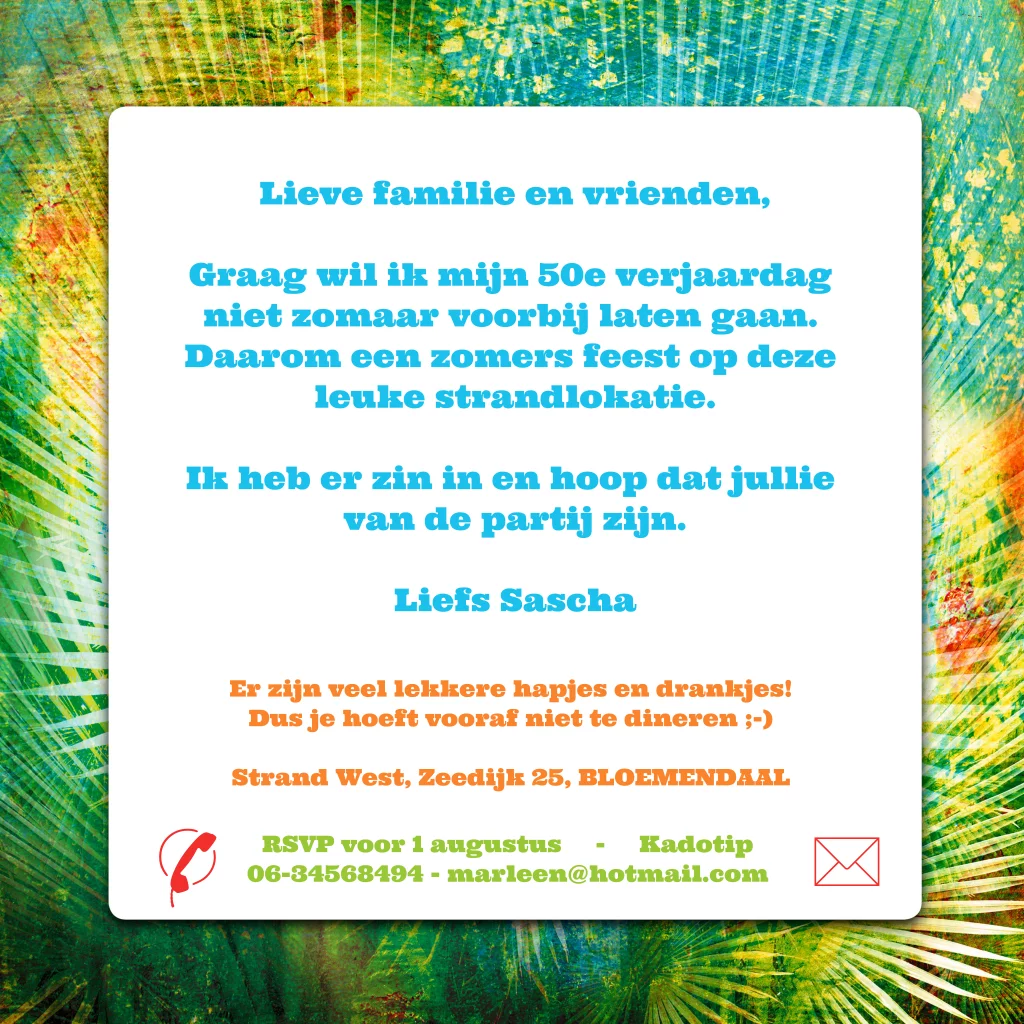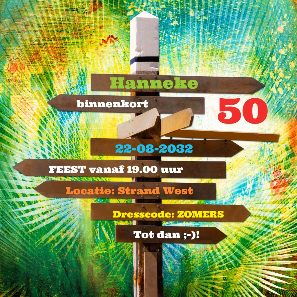 Word je in de zomer 50 of heb je zin in een tropisch verjaardagsfeest? Stuur dan deze vrolijke uitnodigingskaart naar je gasten.