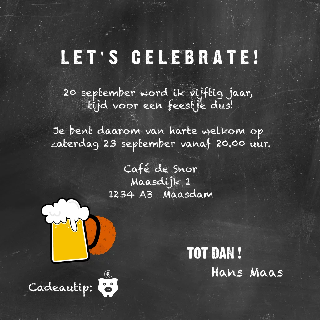 Wat kan er niet ontbreken wanneer je je 50e Abraham verjaardag viert? Precies, het snelheidsbord. Nodig al je familie en vrienden uit met deze leuk geïllustreerde verkeersbord kaart op krijtbord.