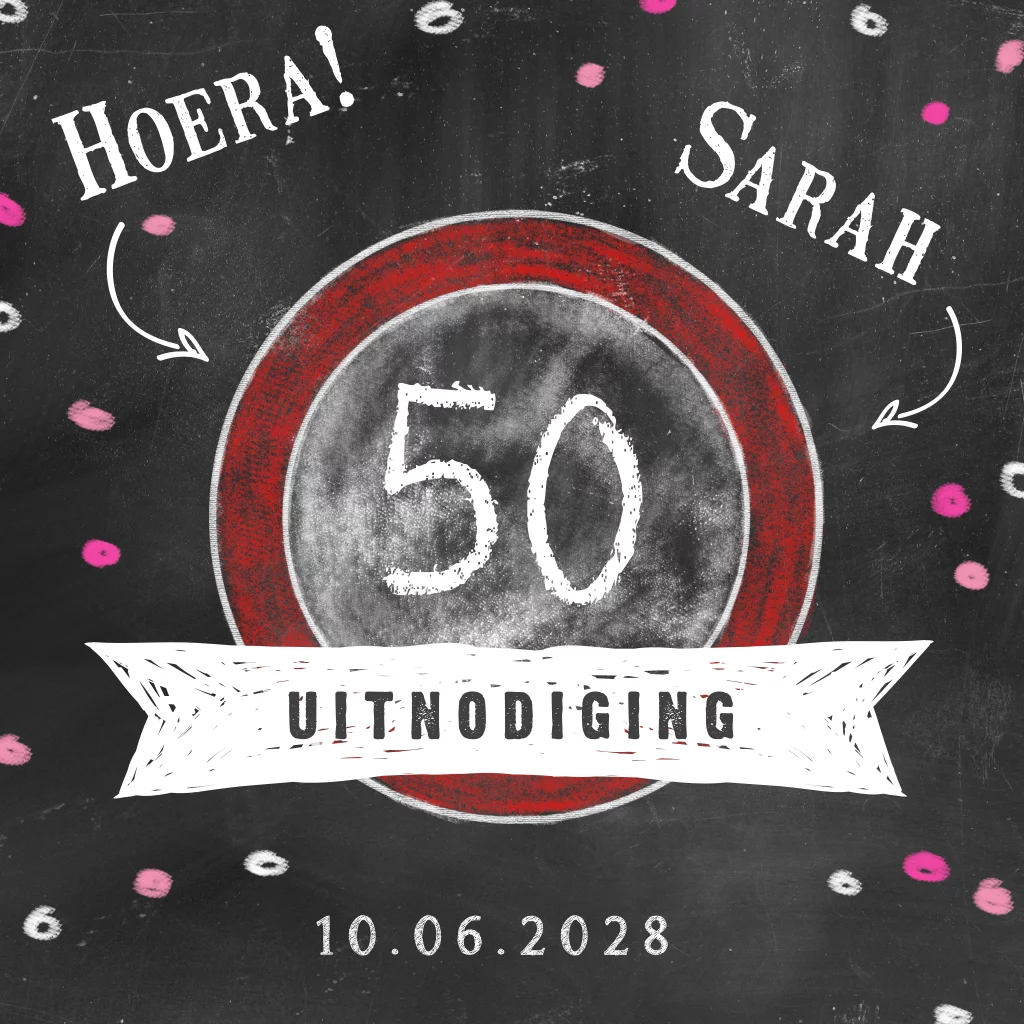 Wat kan er niet ontbreken wanneer je je 50e verjaardag viert? Precies, het snelheidsbord. Nodig al je vrienden uit met deze leuk geïllustreerde verkeersbord kaart op krijtbord.